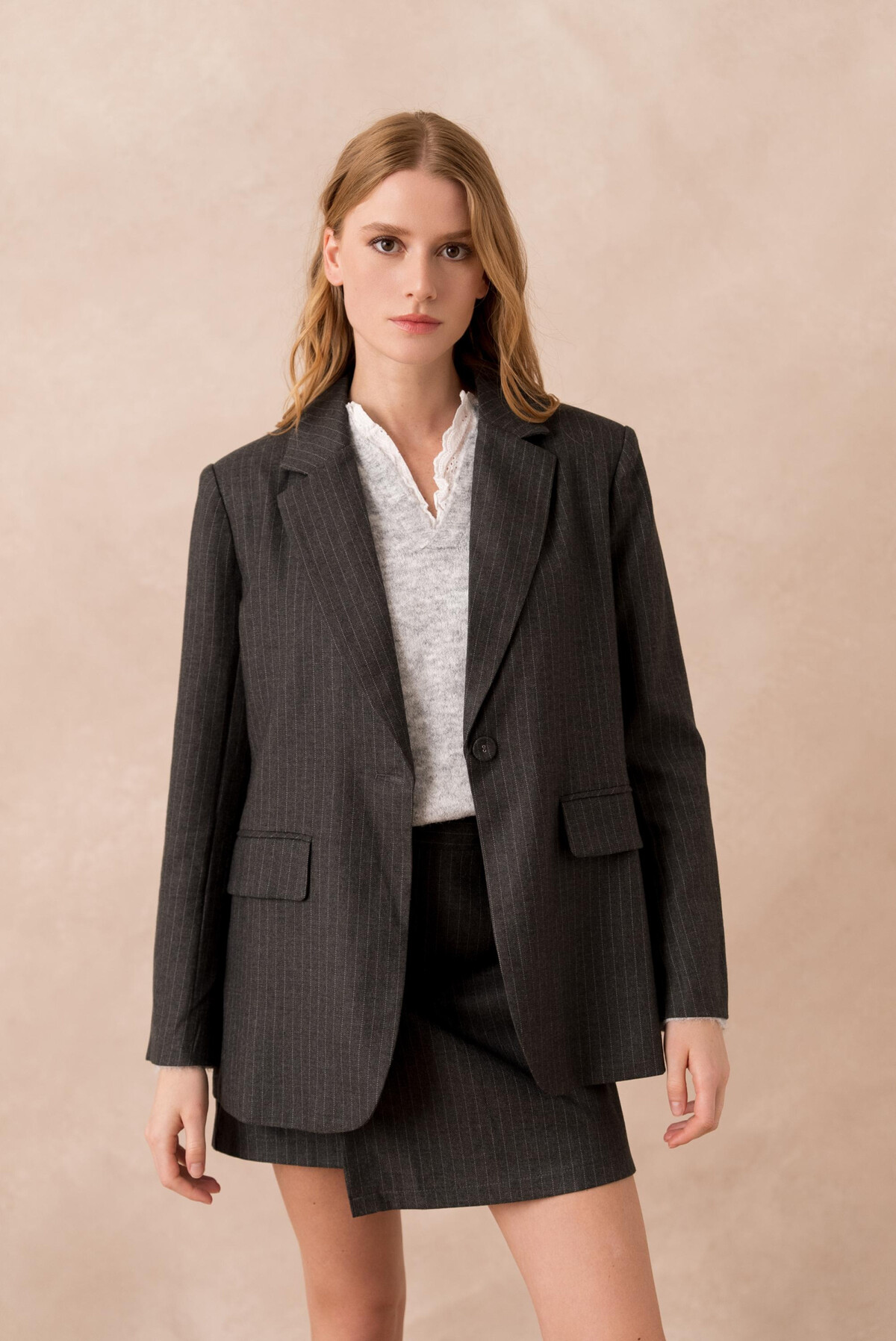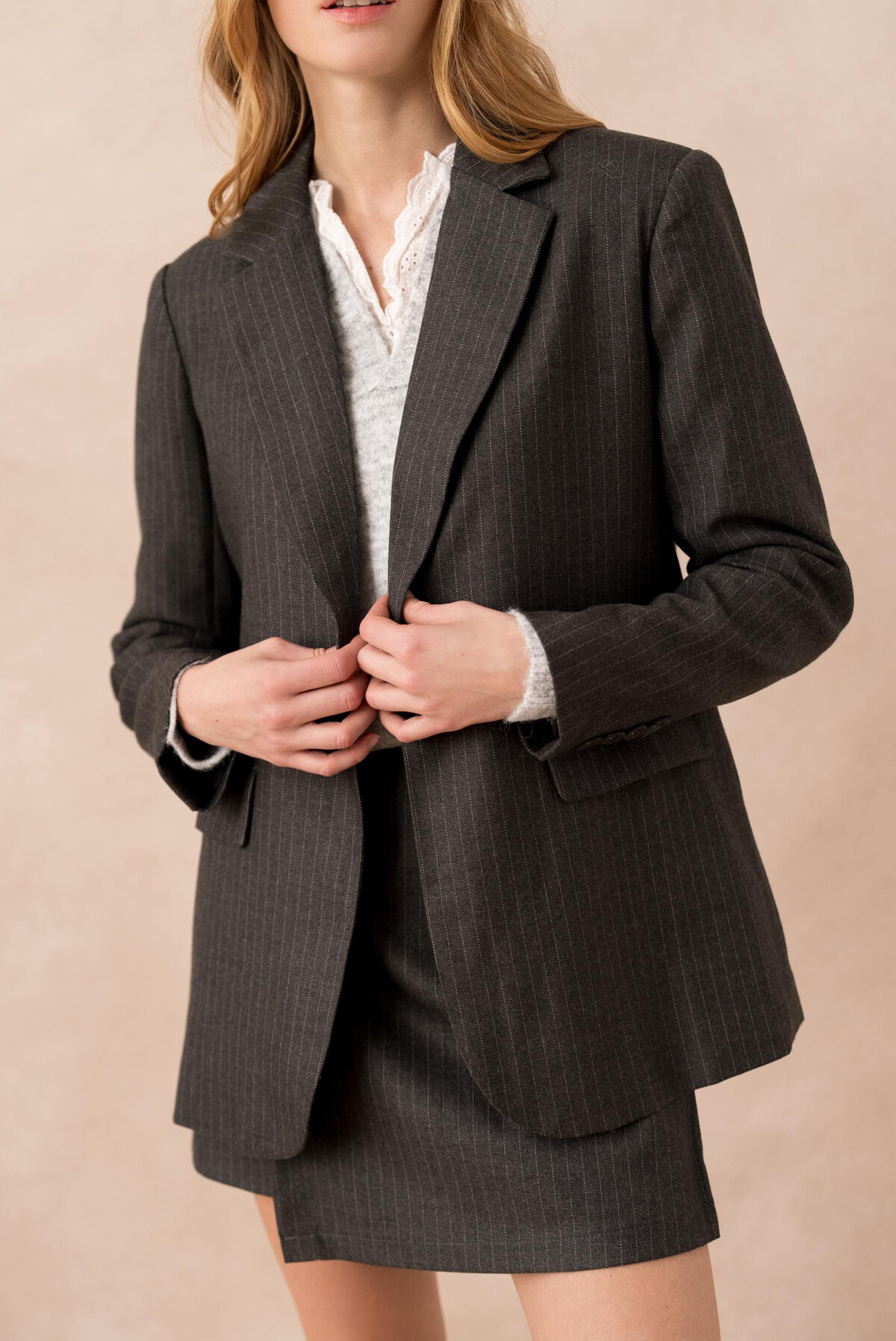 Coupe droite. Imprimé fines rayures. Col en V avec rabat. Revers crantés. Manches longues boutonnées. Deux poches à rabat sur le devant. Fermeture à bouton sur le devant.