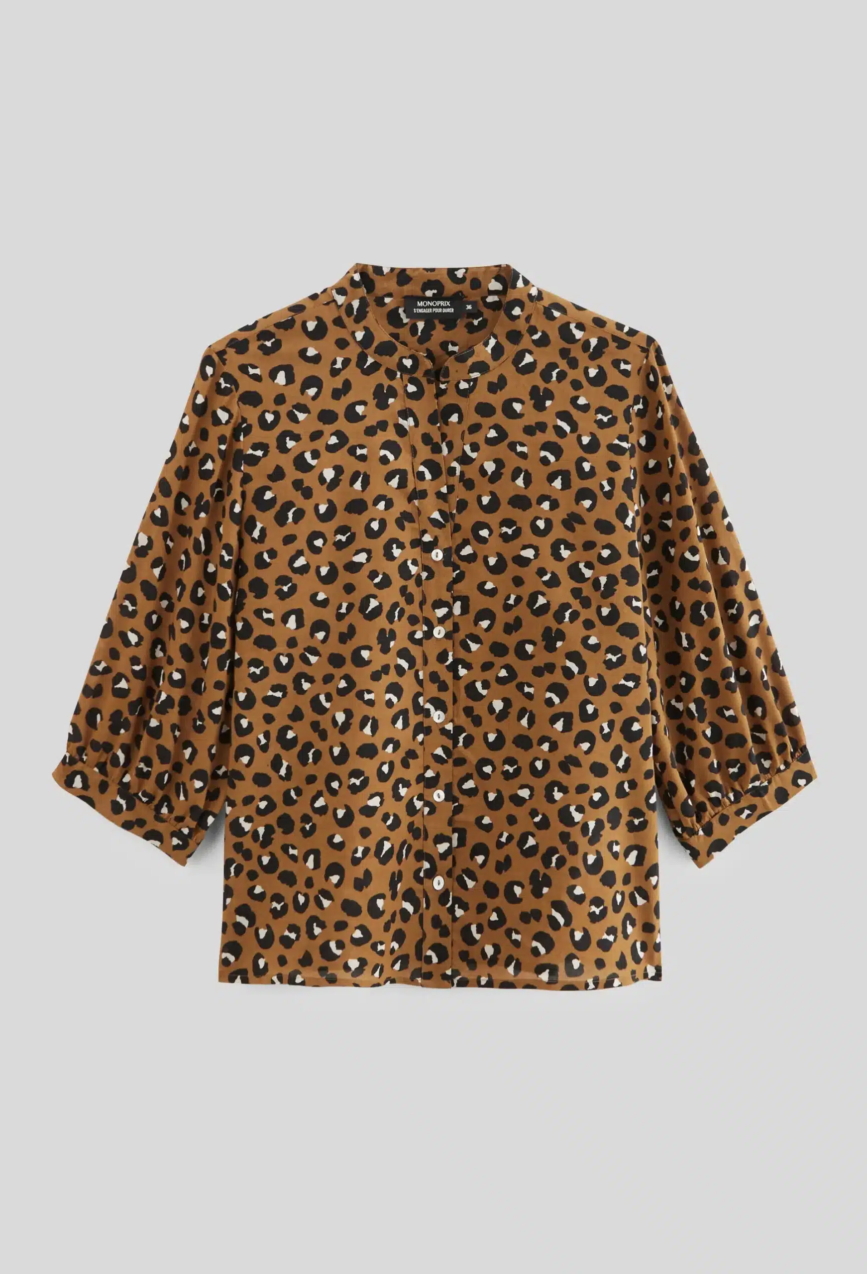 Chemisier imprimé léopard coupe droite, col rond ouvert en V, maille légère avec fermeture boutonnée.
