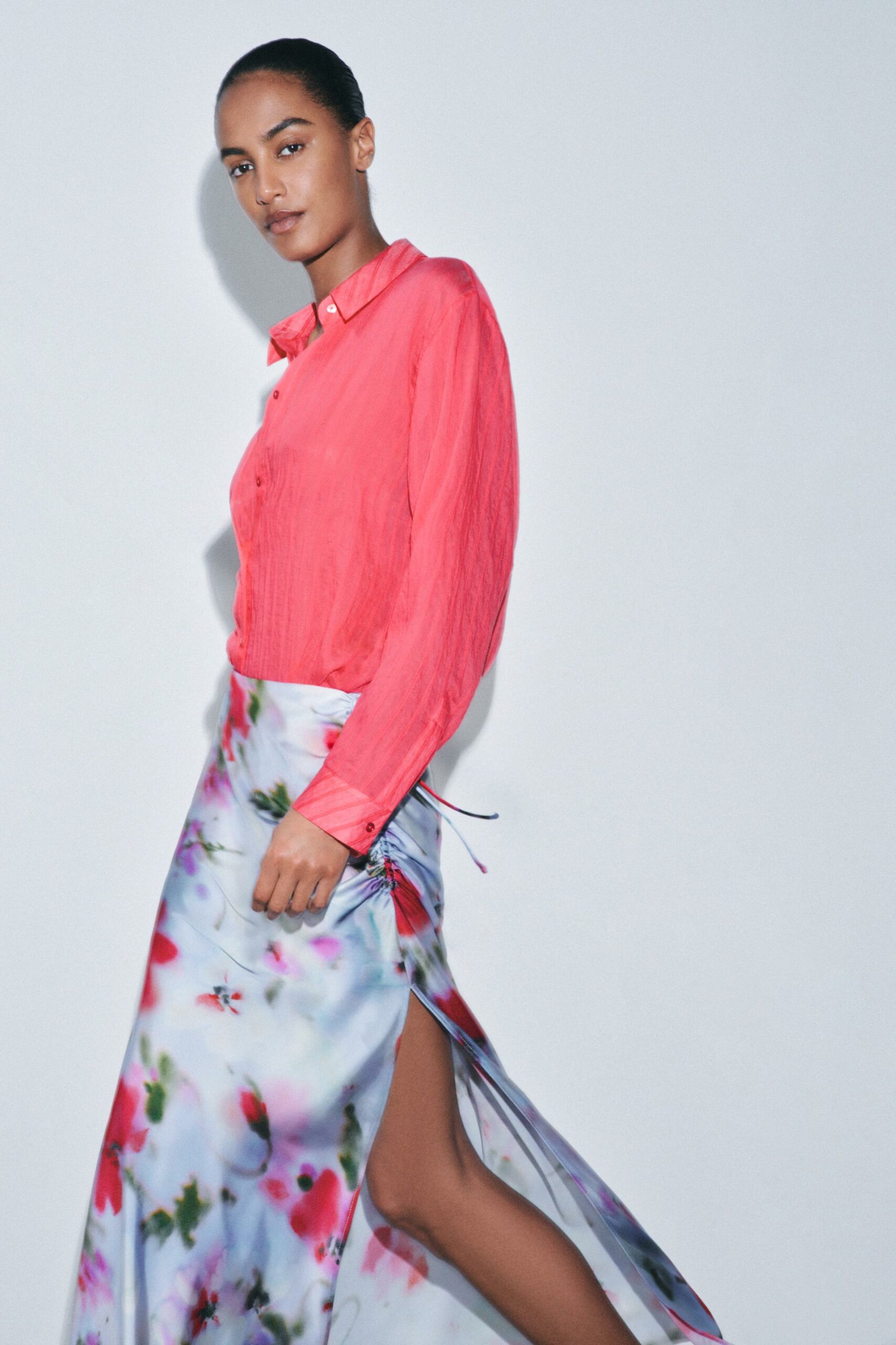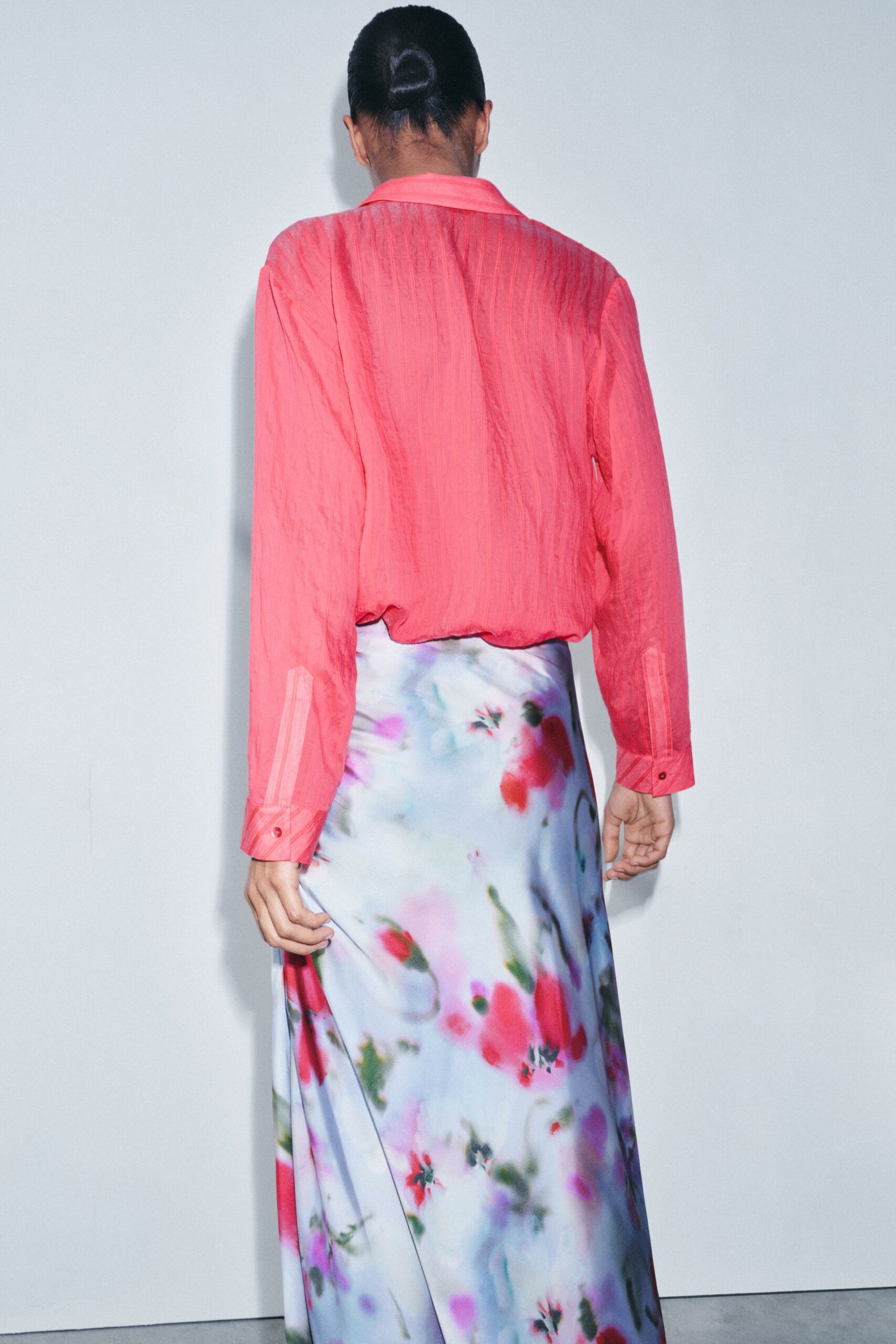Chemise fluide avec col à revers et manches longues. Fermeture par boutons sur le devant.