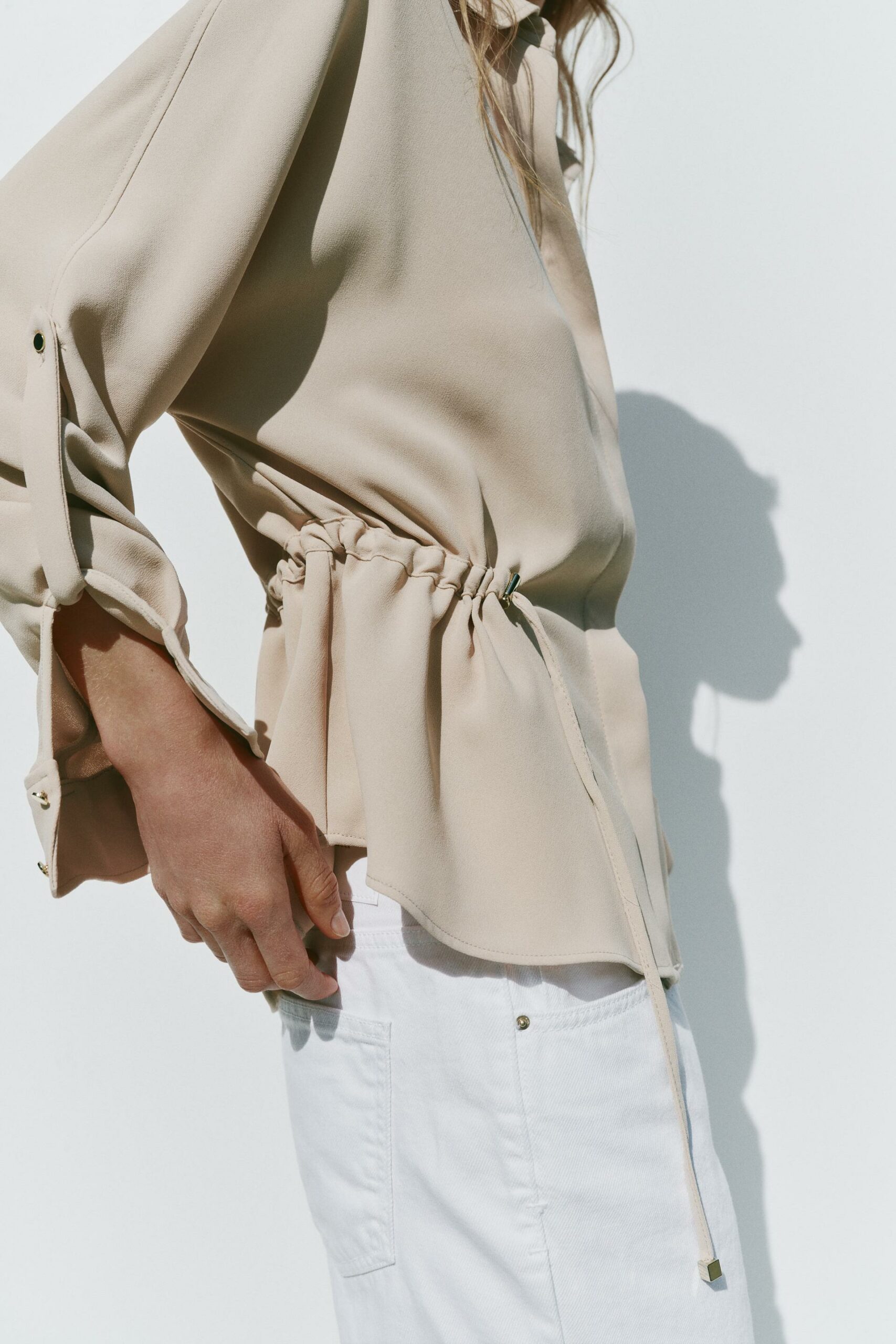 Chemise avec col à revers et manches longues terminées par un revers avec patte et bouton. Poche avant plaquée avec rabat. Taille ajustable avec lacet. Fermeture par boutons sur le devant.