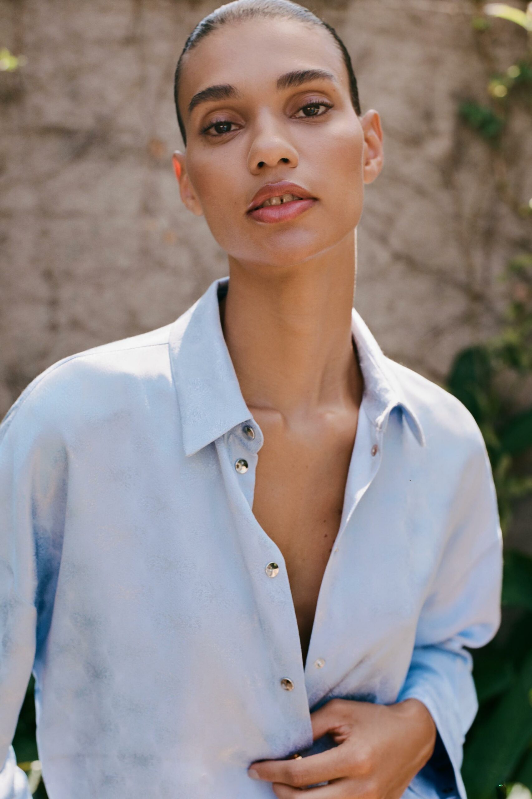 Chemise avec col à revers et manches longues. Bas avec fentes latérales. Fermeture par boutons-pression sur le devant.