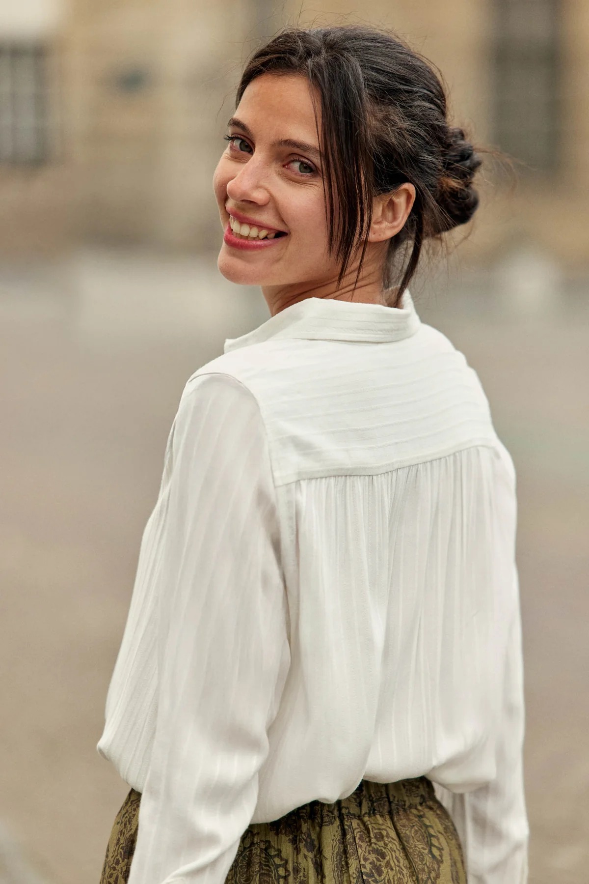 chemise fluide droite et ample écrue, avec col chemise, fronces dans le dos et boutonnage devant.