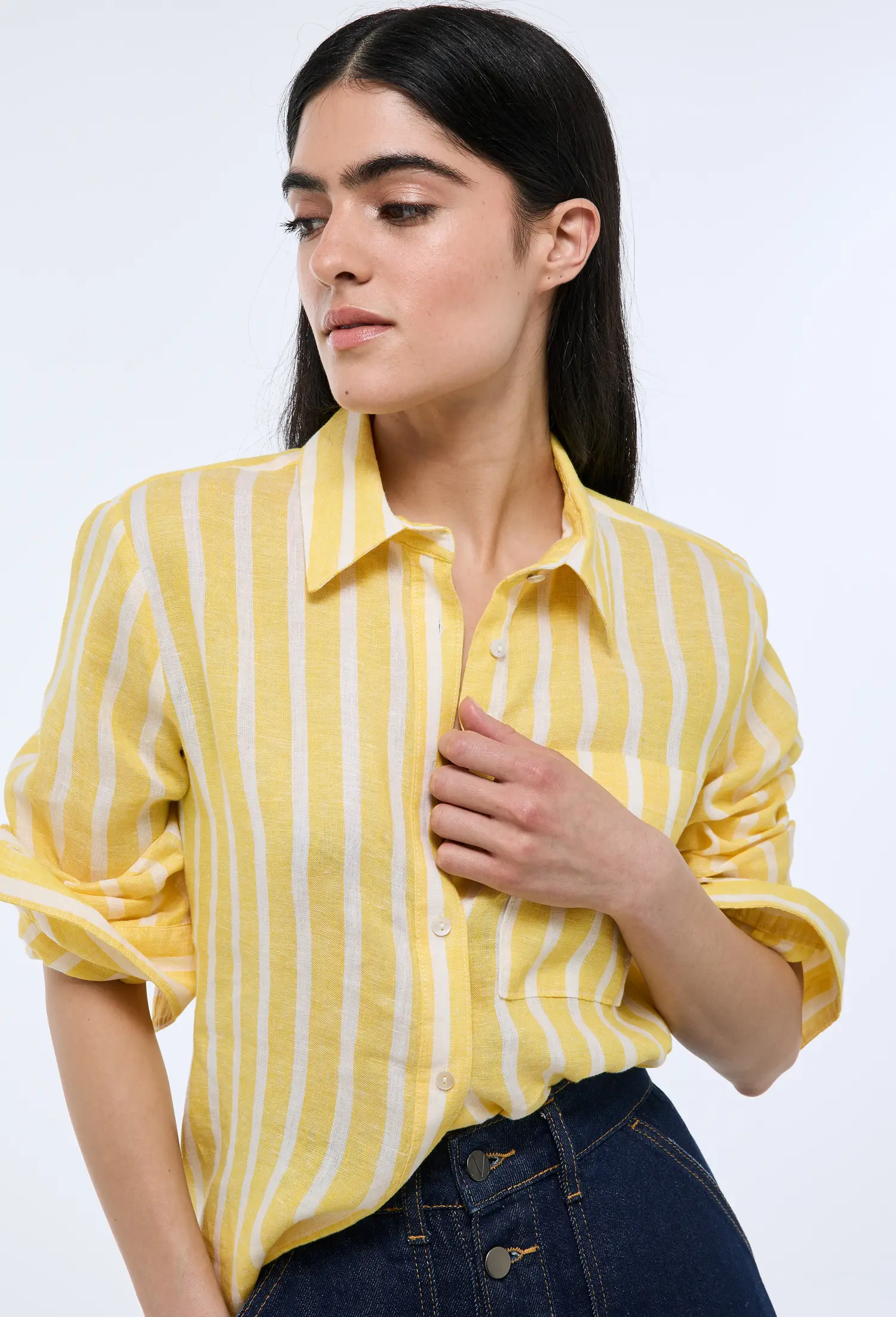 Chemise en lin à larges rayures, col à pointes, manches longues avec poignets boutonnés. Fermeture boutonnée devant et poche plaquée à la poitrine