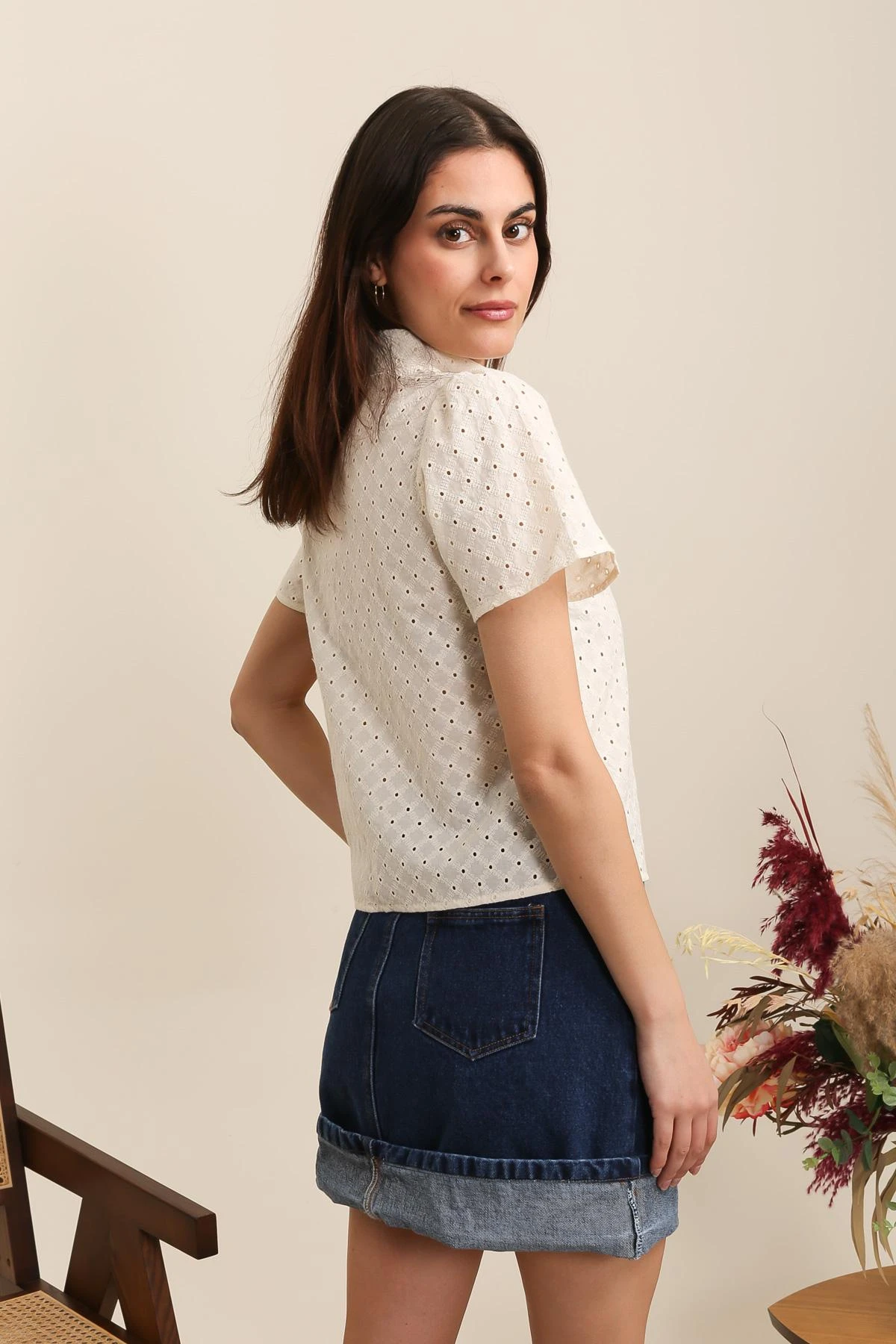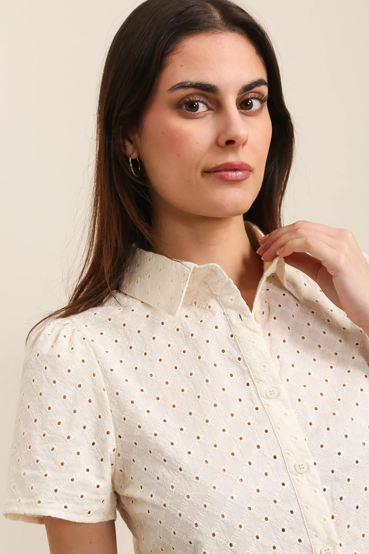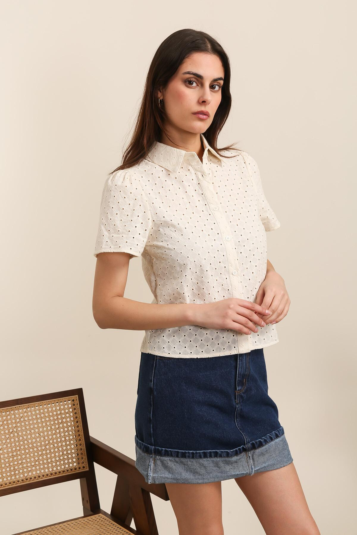 Chemisette à manches courtes en coton rebrodé à formes géométriques losange