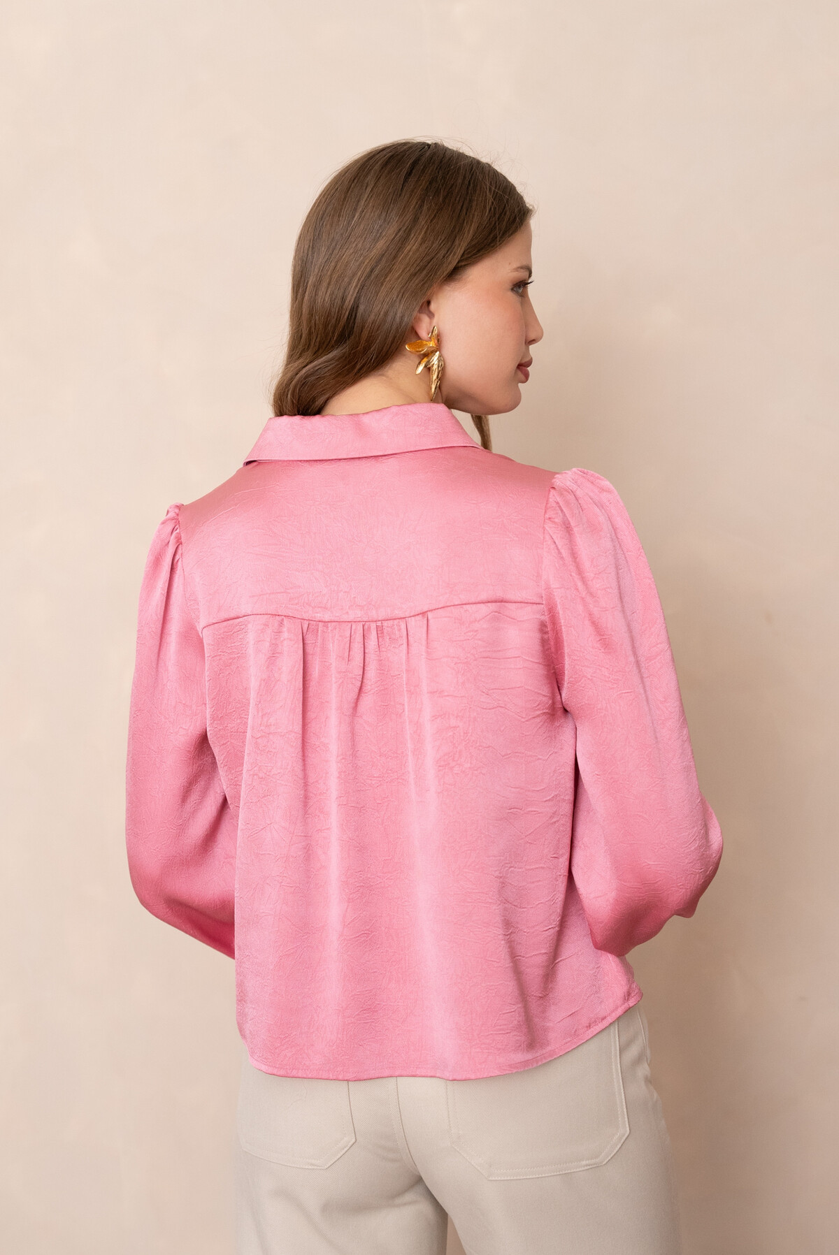 Chemisier satiné à manches longues et boutons blancs et dorés