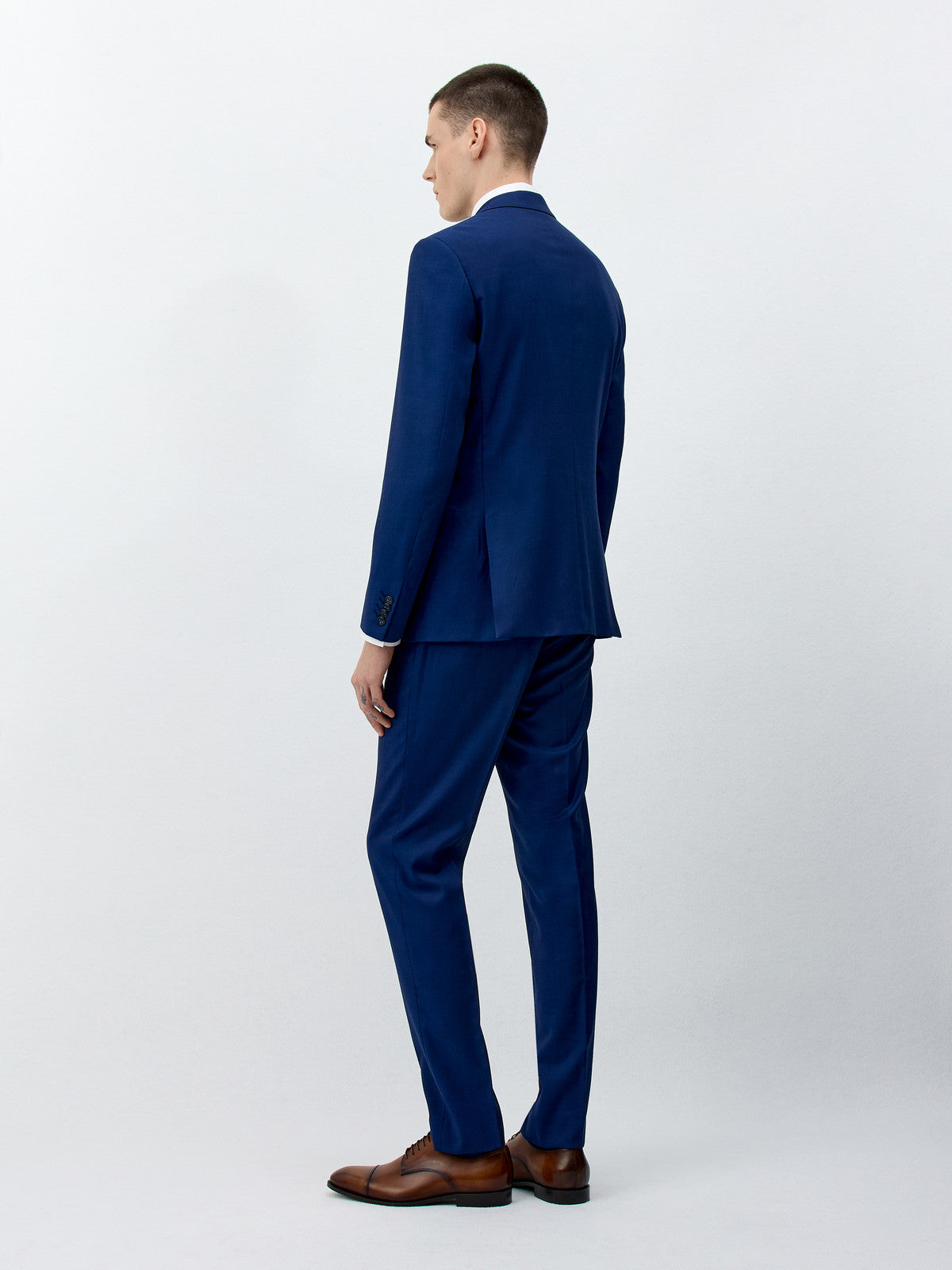 Ce costume slim en laine bleu cobalt séduit par sa couleur vibrante et sa coupe ajustée qui valorise la silhouette. Son tissu de qualité assure confort et tenue impeccable toute la journée. Un choix audacieux pour un look élégant et moderne.