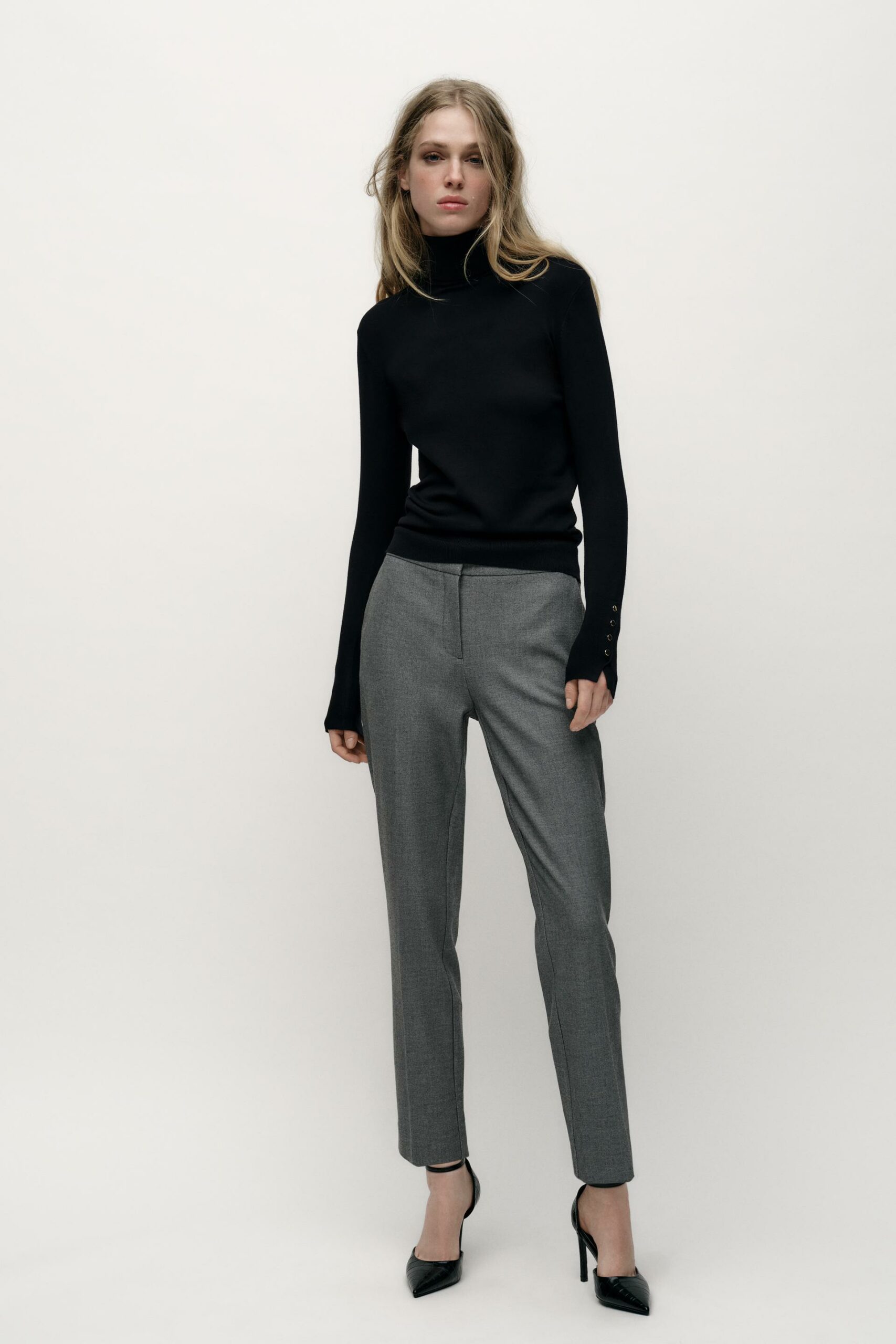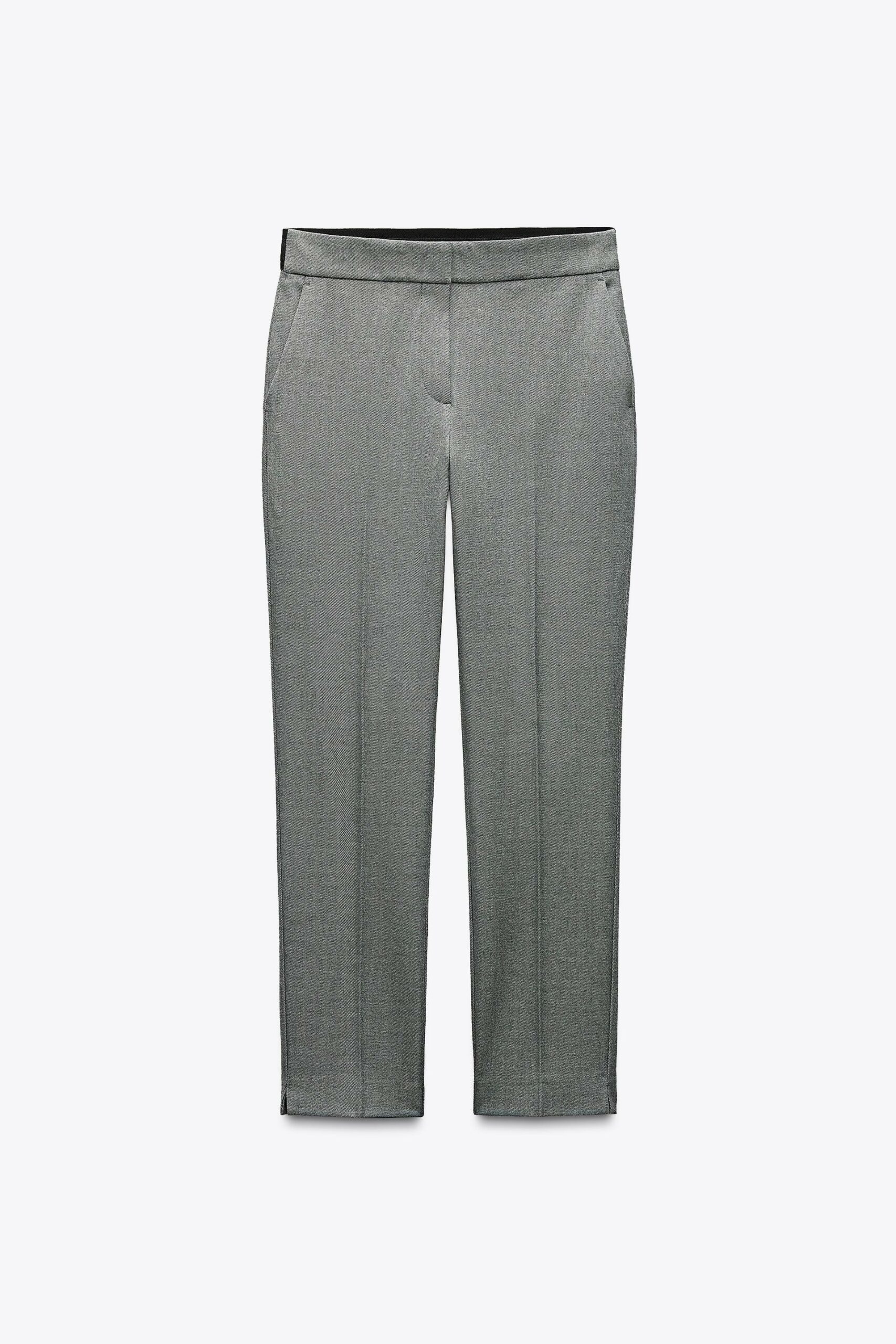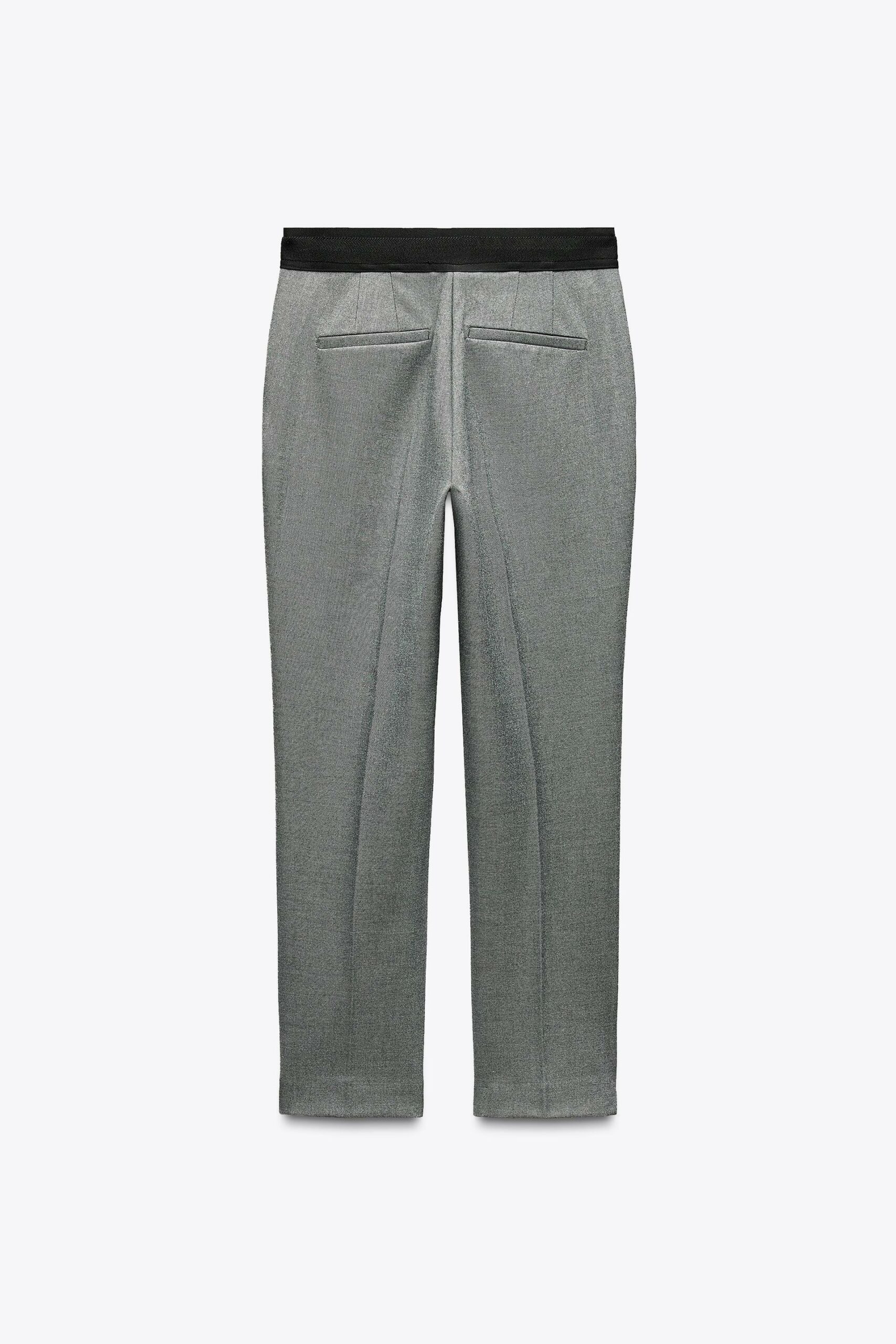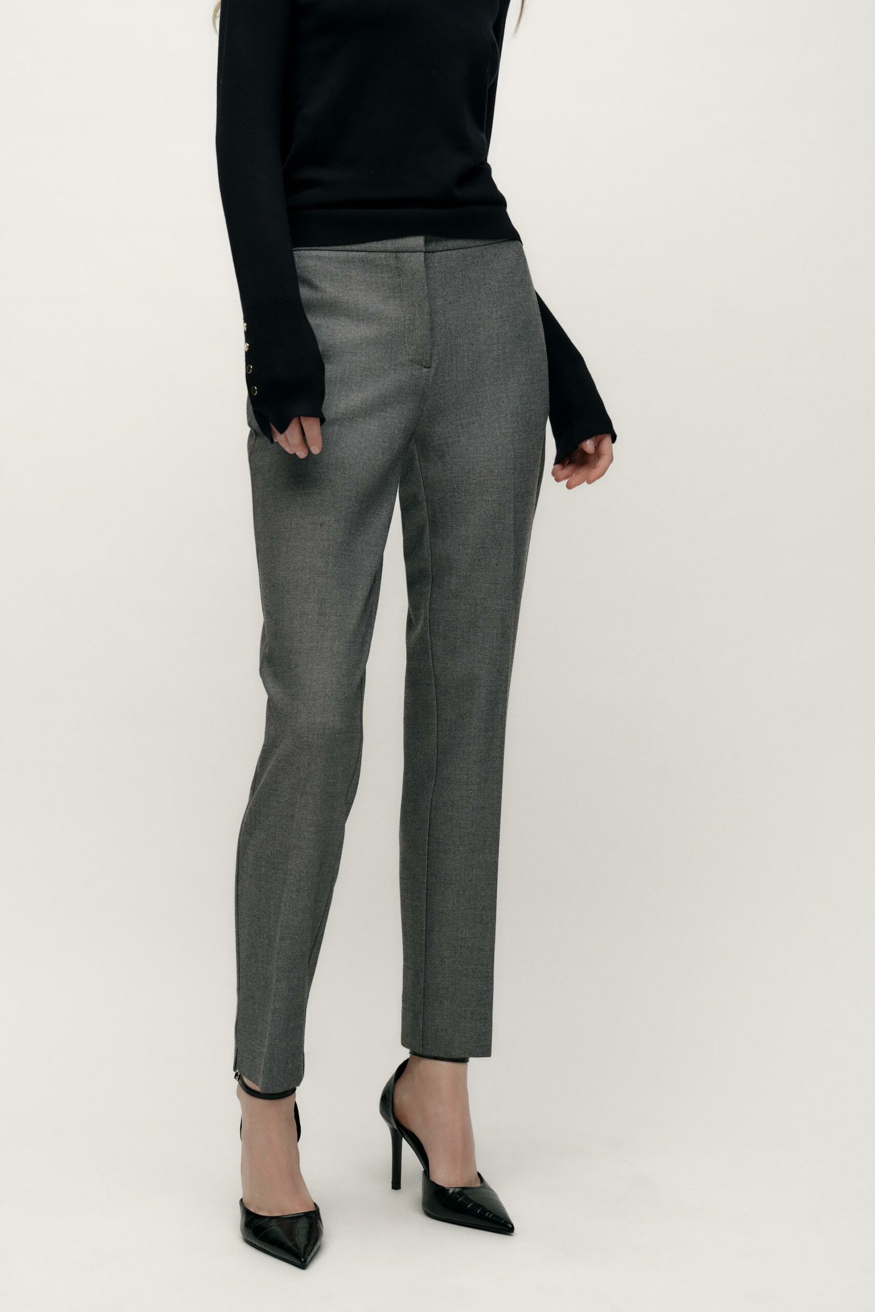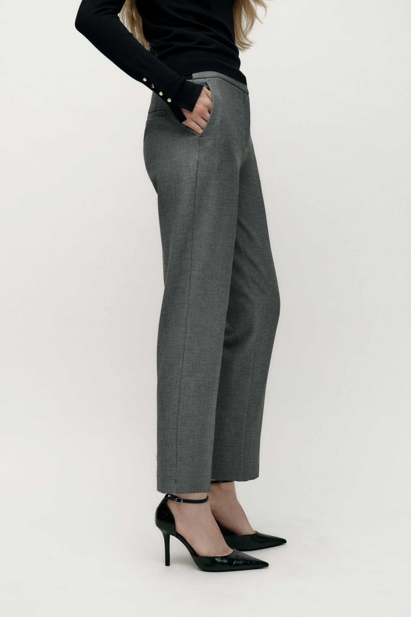 Pantalon longueur 7/8 taille haute. Jambe droite sans couture. Fermeture devant avec zip et agraphe.