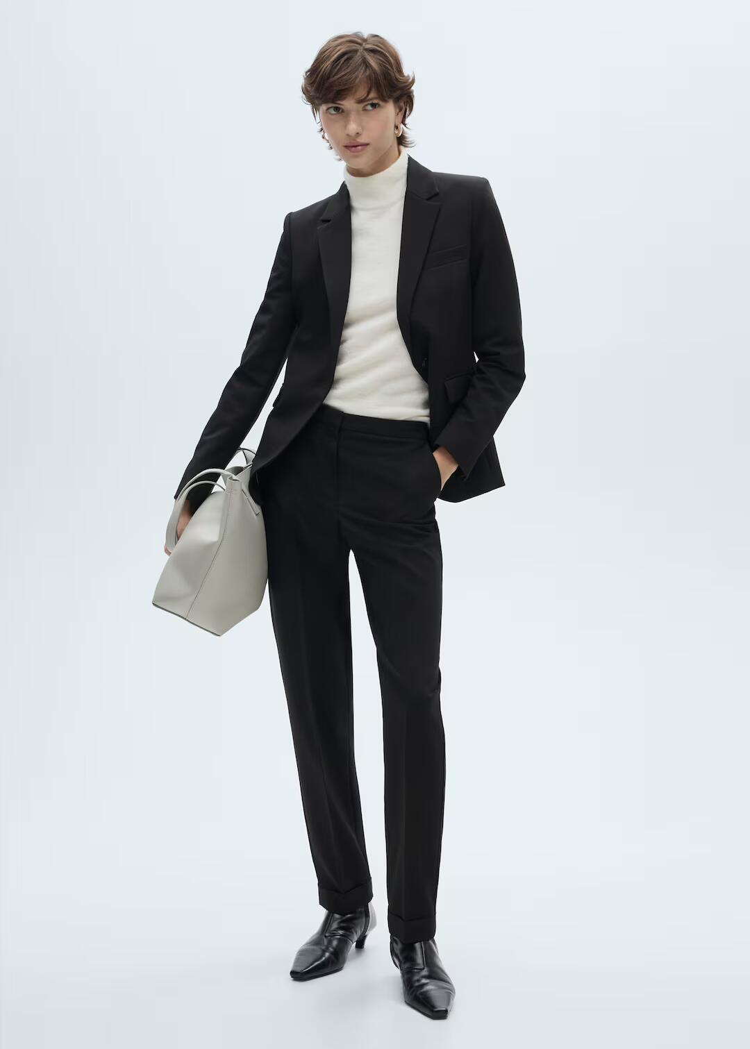 Coupe standard. Coupe droite. Style costume. Taille mi-haute. Passants de ceinture. Deux poches latérales. Deux poches passepoilées à l’arrière.