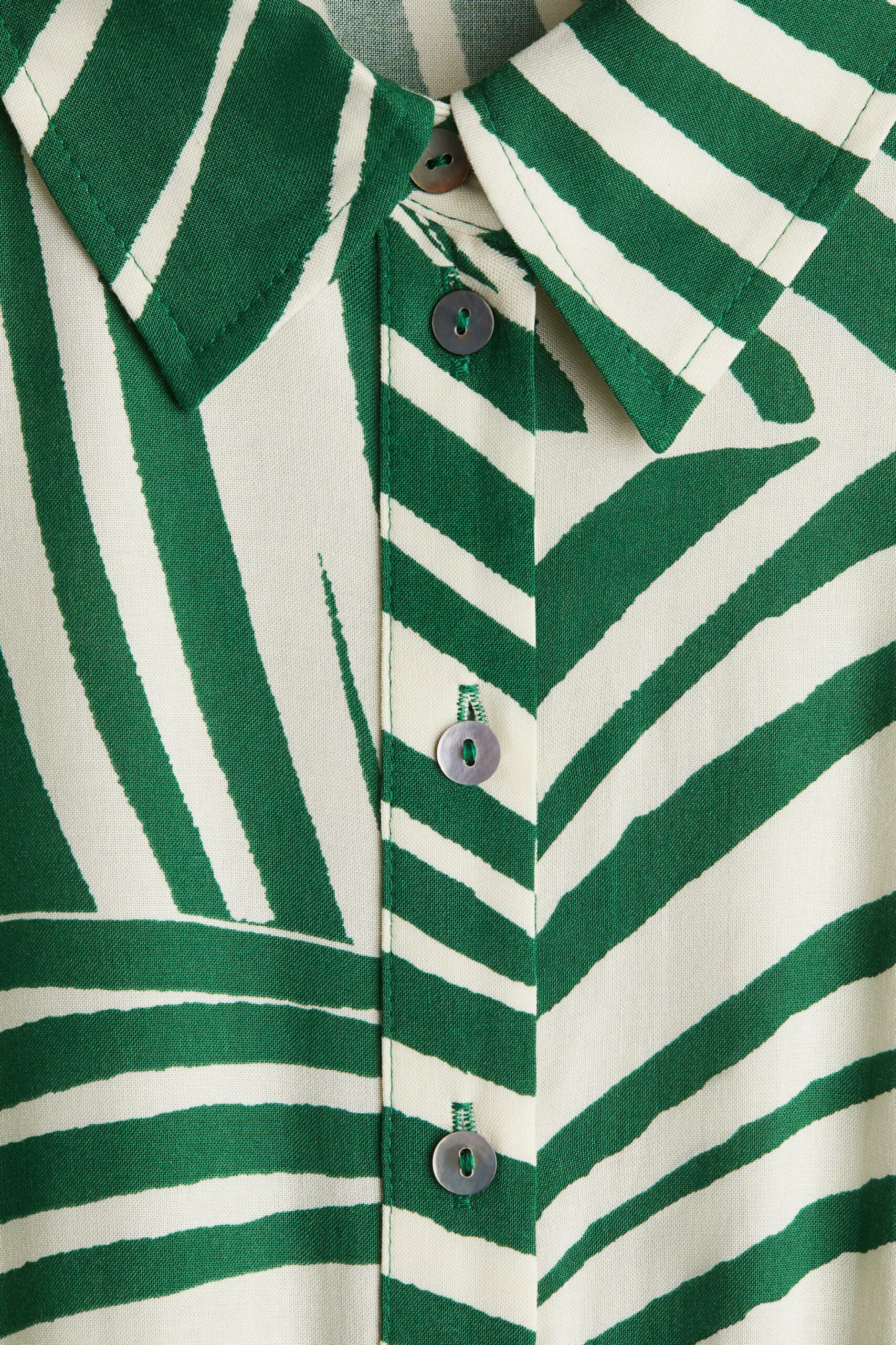 Robe de longueur mi-mollet en matière tissée. Modèle avec col, courtes manches raglan et boutonnage devant. Fronces devant et dans le dos, ceinture à nouer amovible et petit élastique à l’arrière de la taille.
