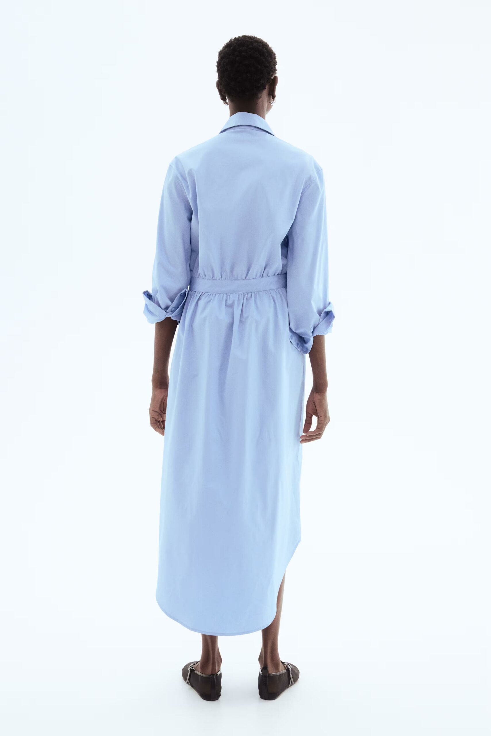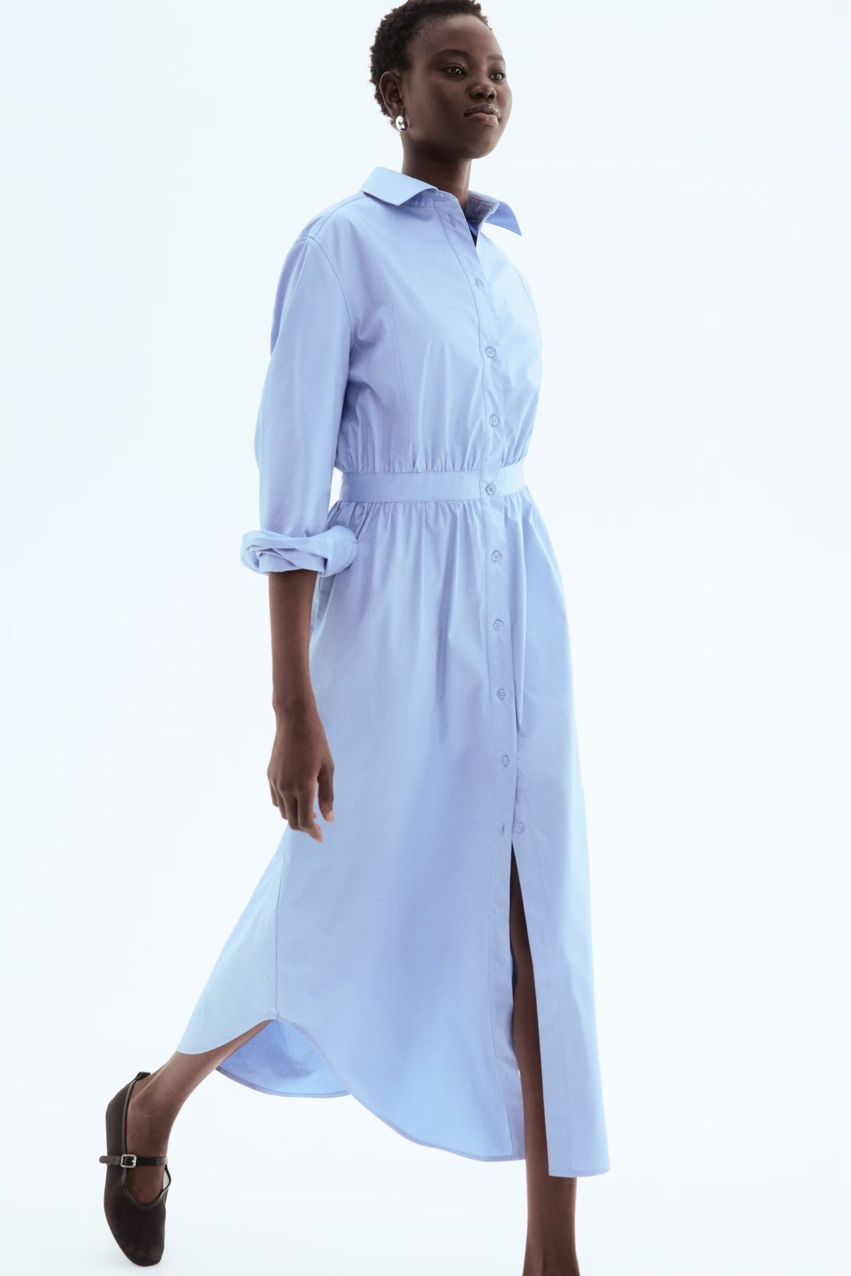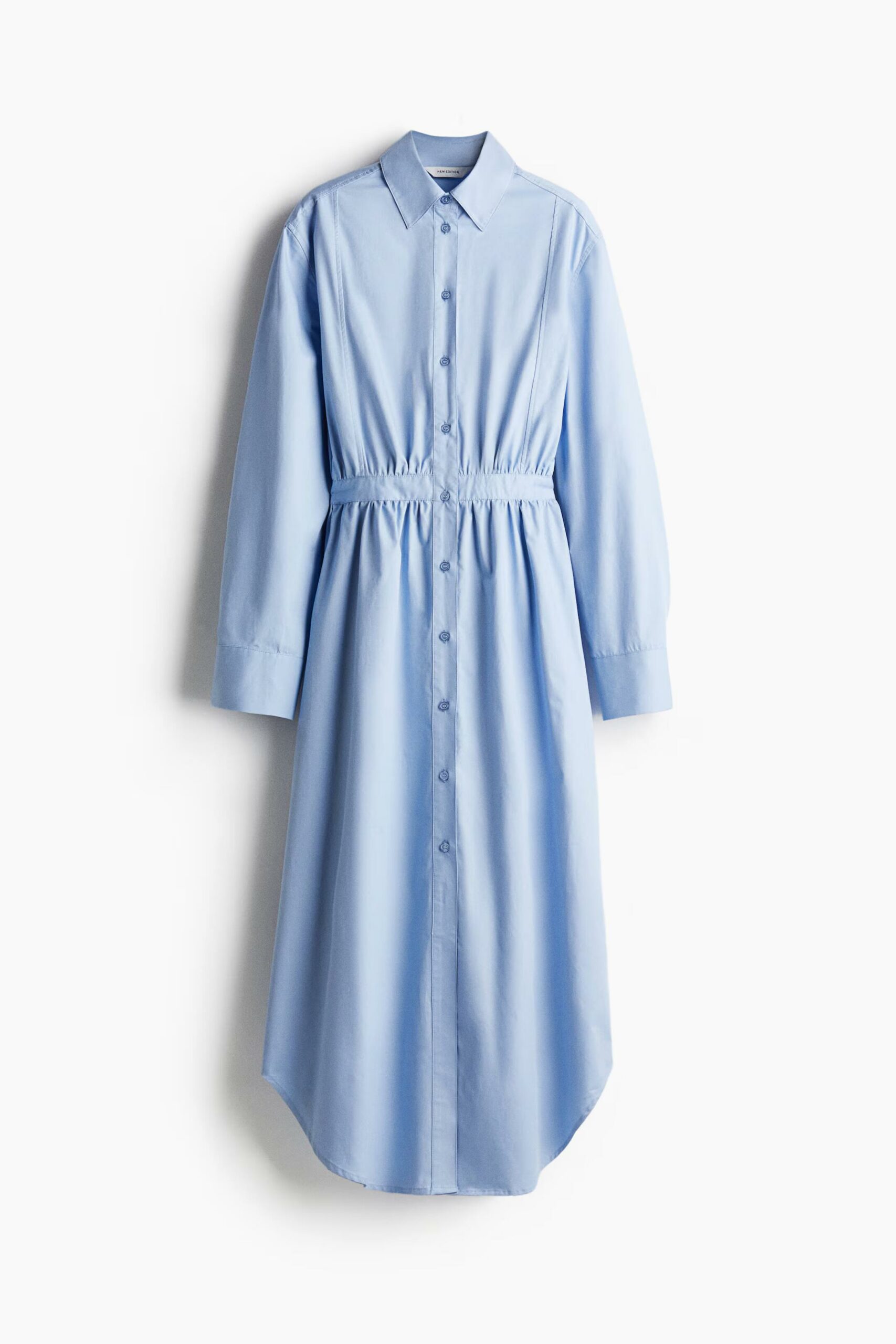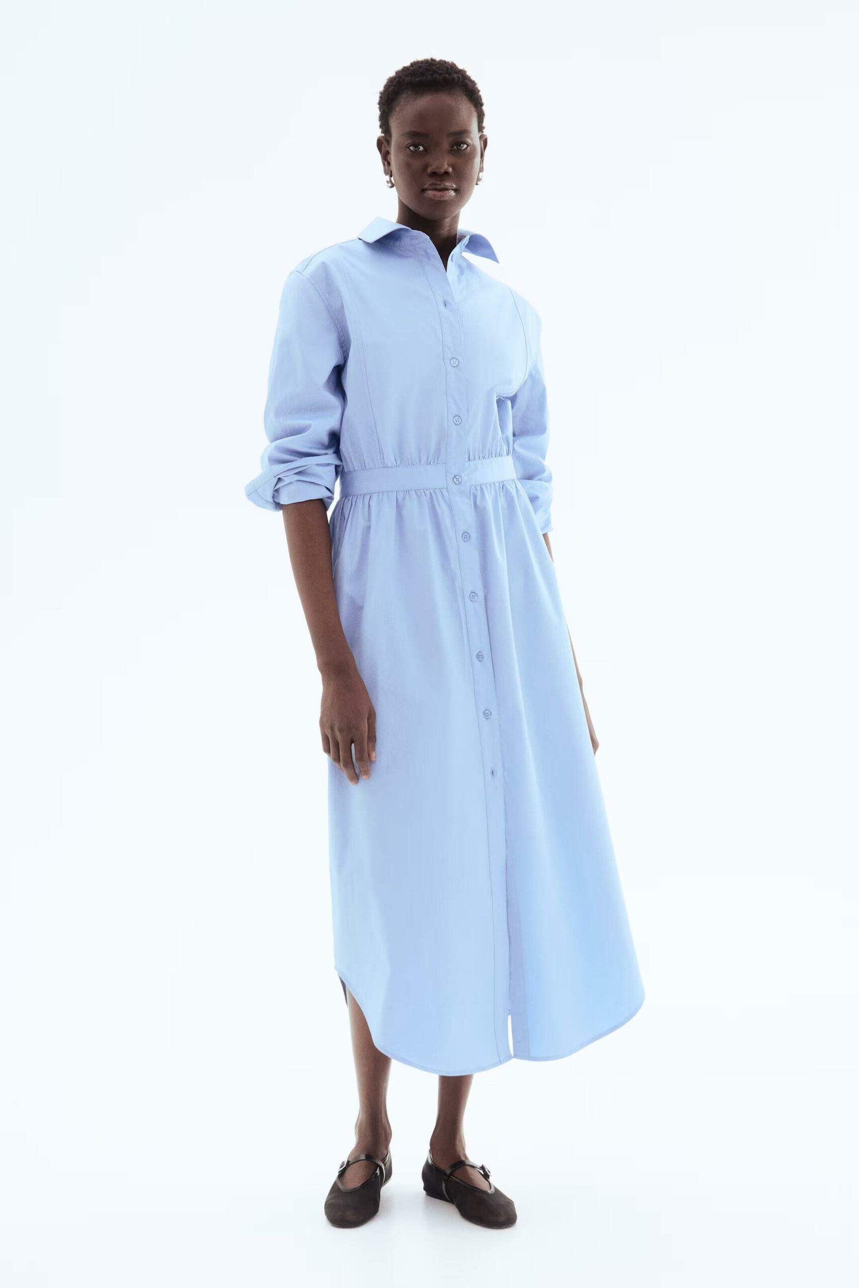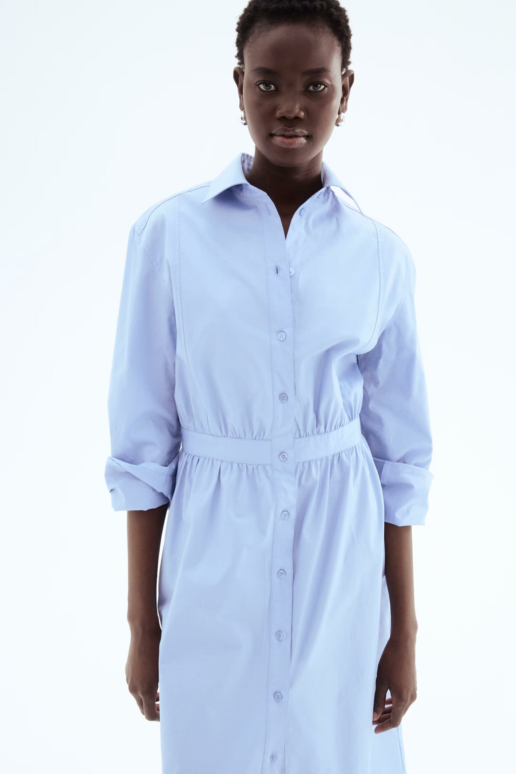 Robe de longueur cheville en twill de coton. Modèle avec col, plastron et boutonnage devant. Manches longues terminées par fente et poignet boutonné. Taille cintrée agrémentée de fronces et base incurvée. Non doublée.