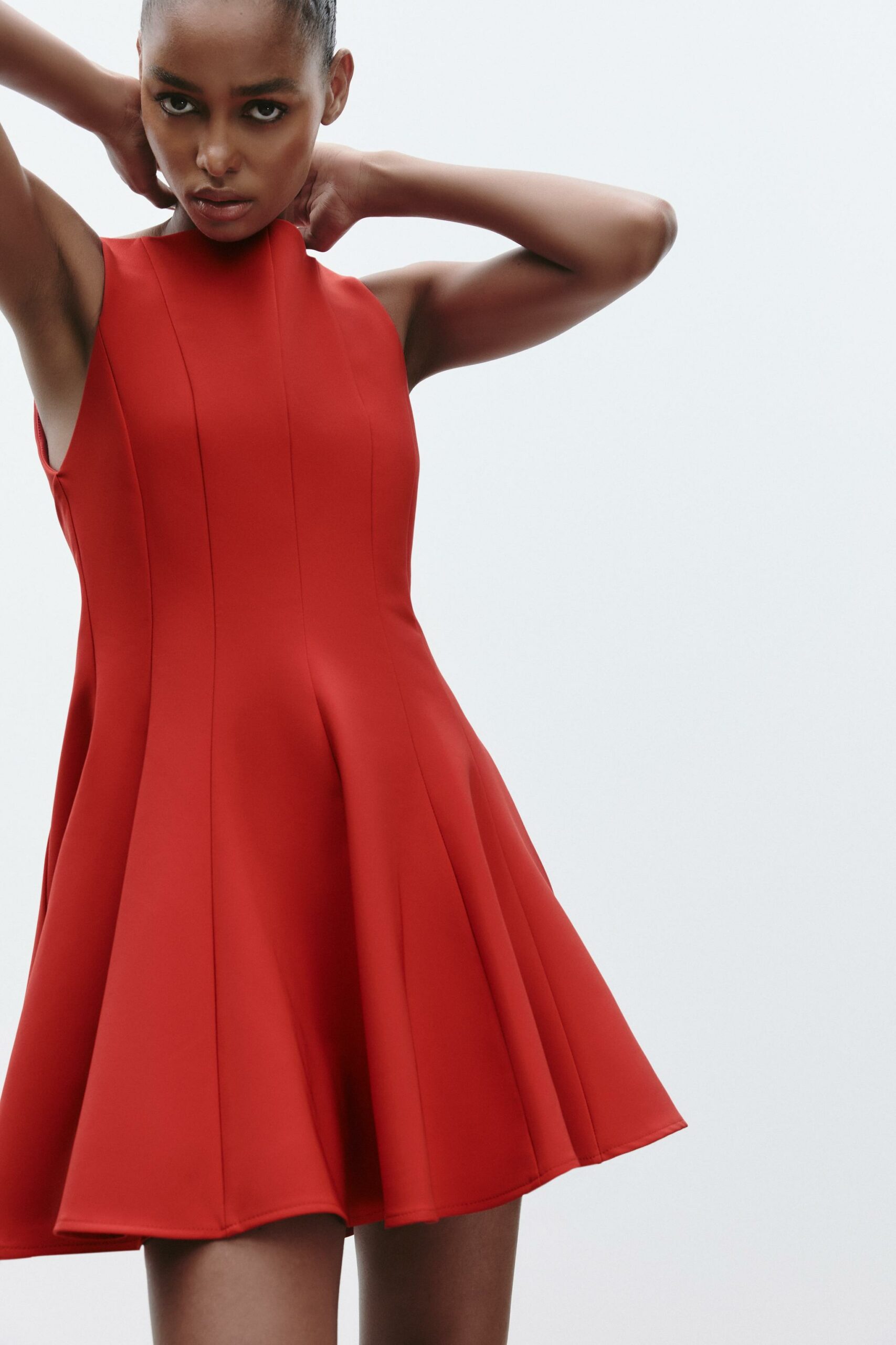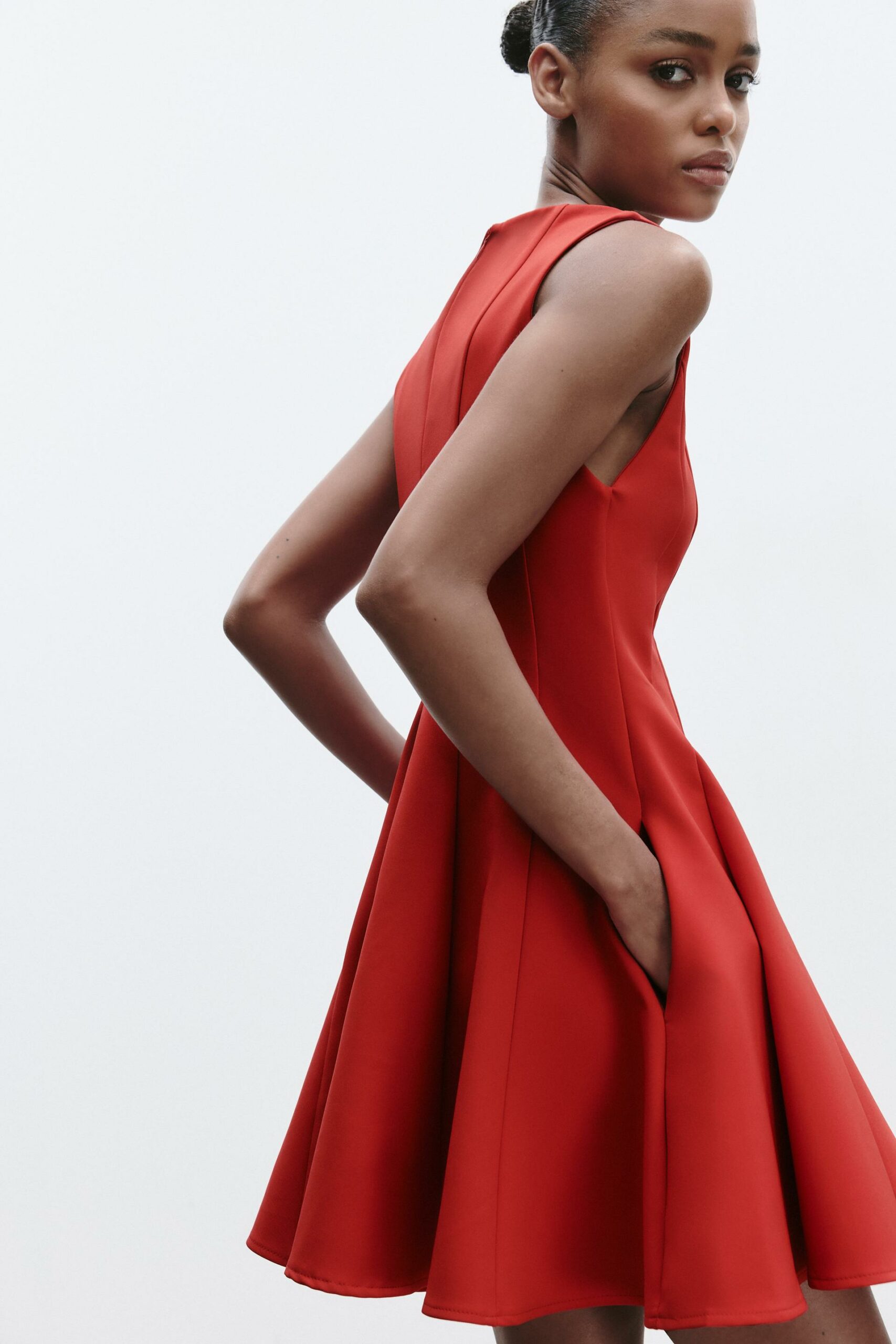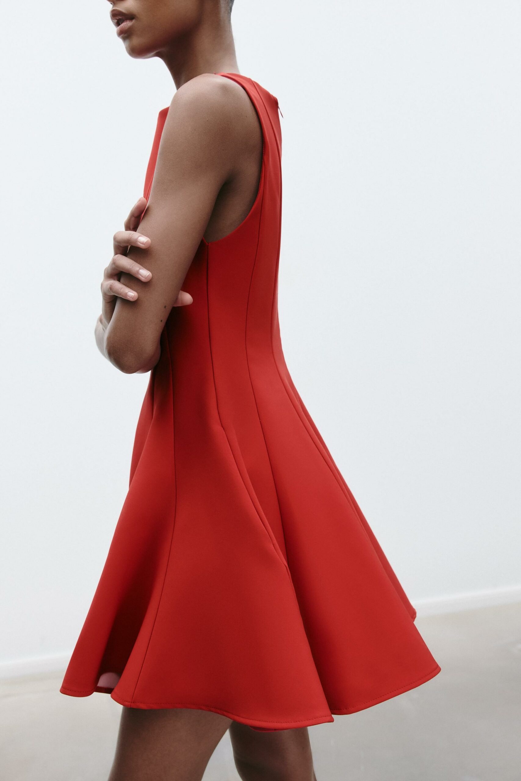 Robe courte à col rond et sans manches. Bas évasé. Fermeture au dos par zip dissimulé dans la couture.