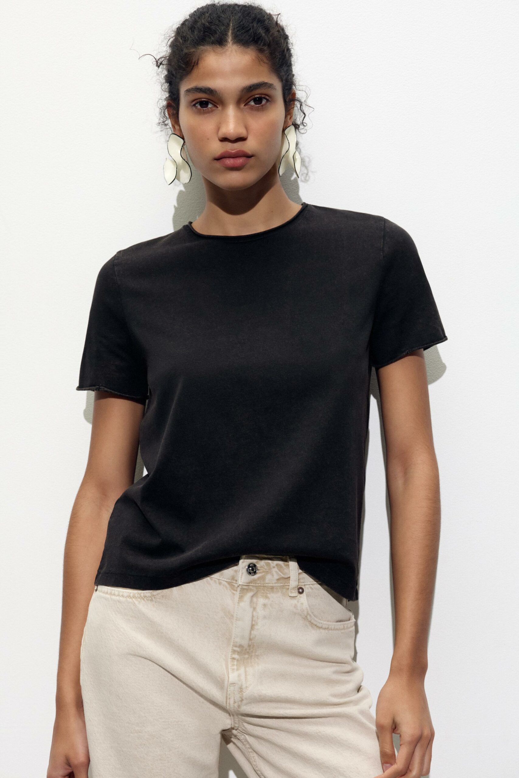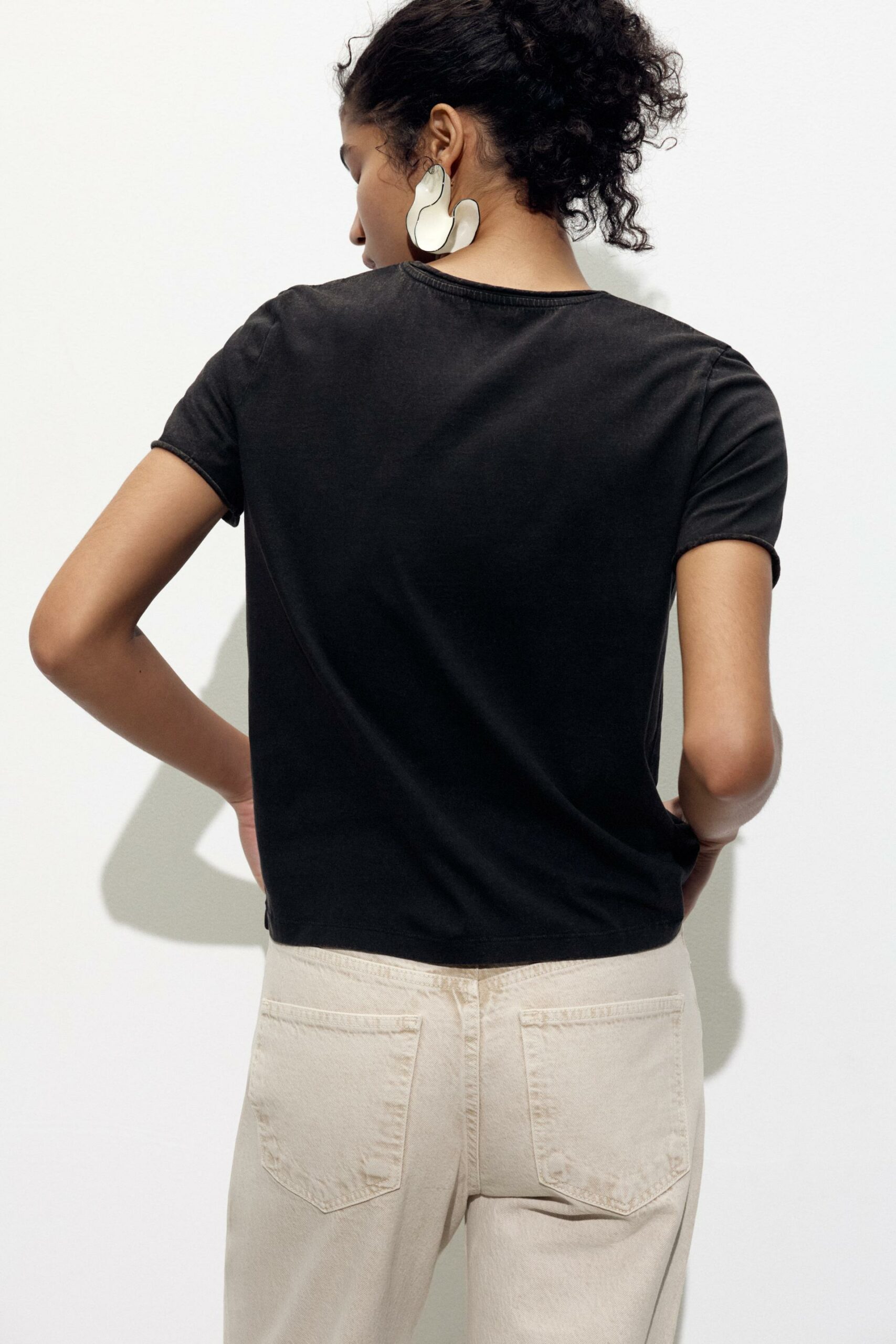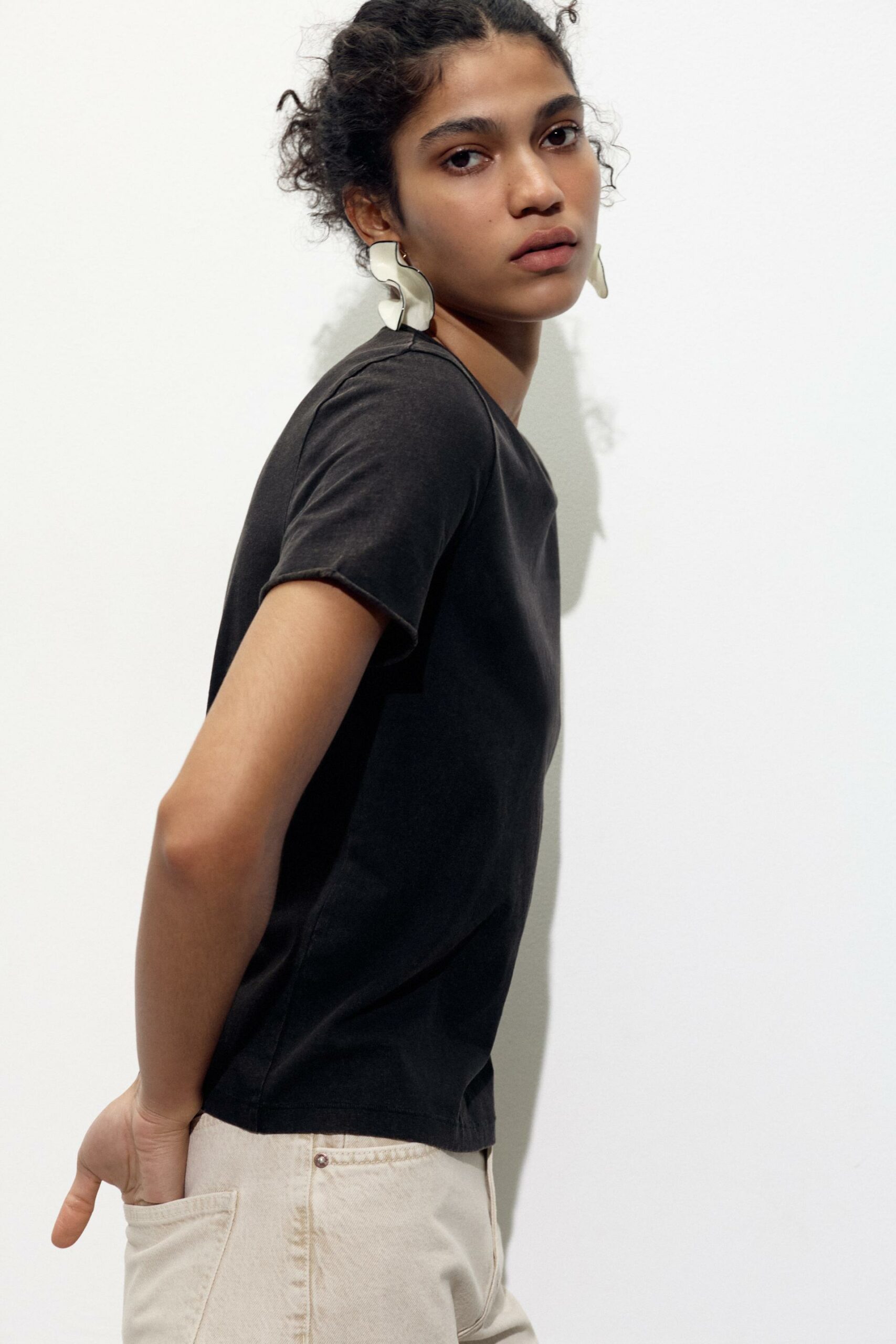T-shirt confectionné en filature de coton. Col rond et manches courtes. Effet délavé.