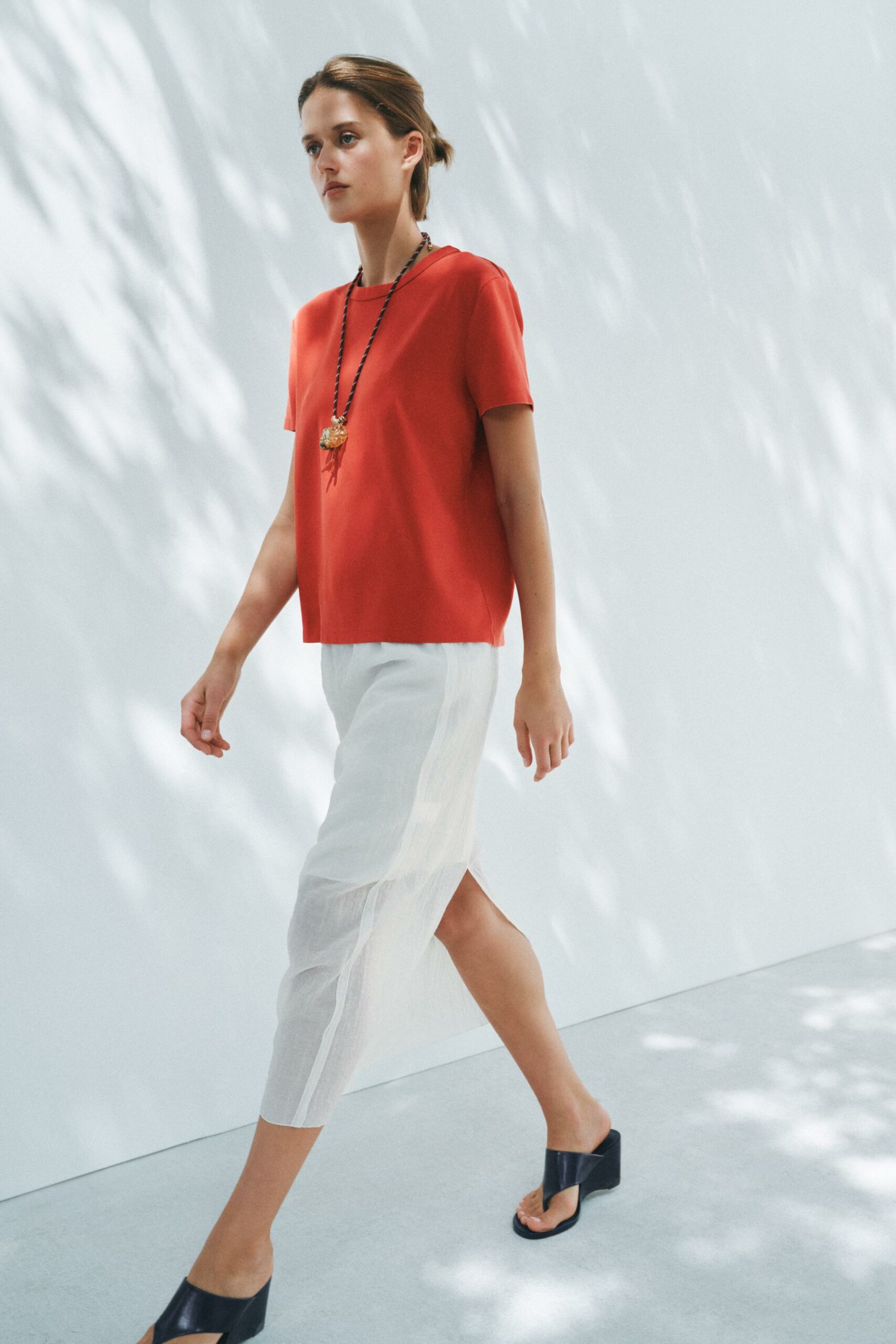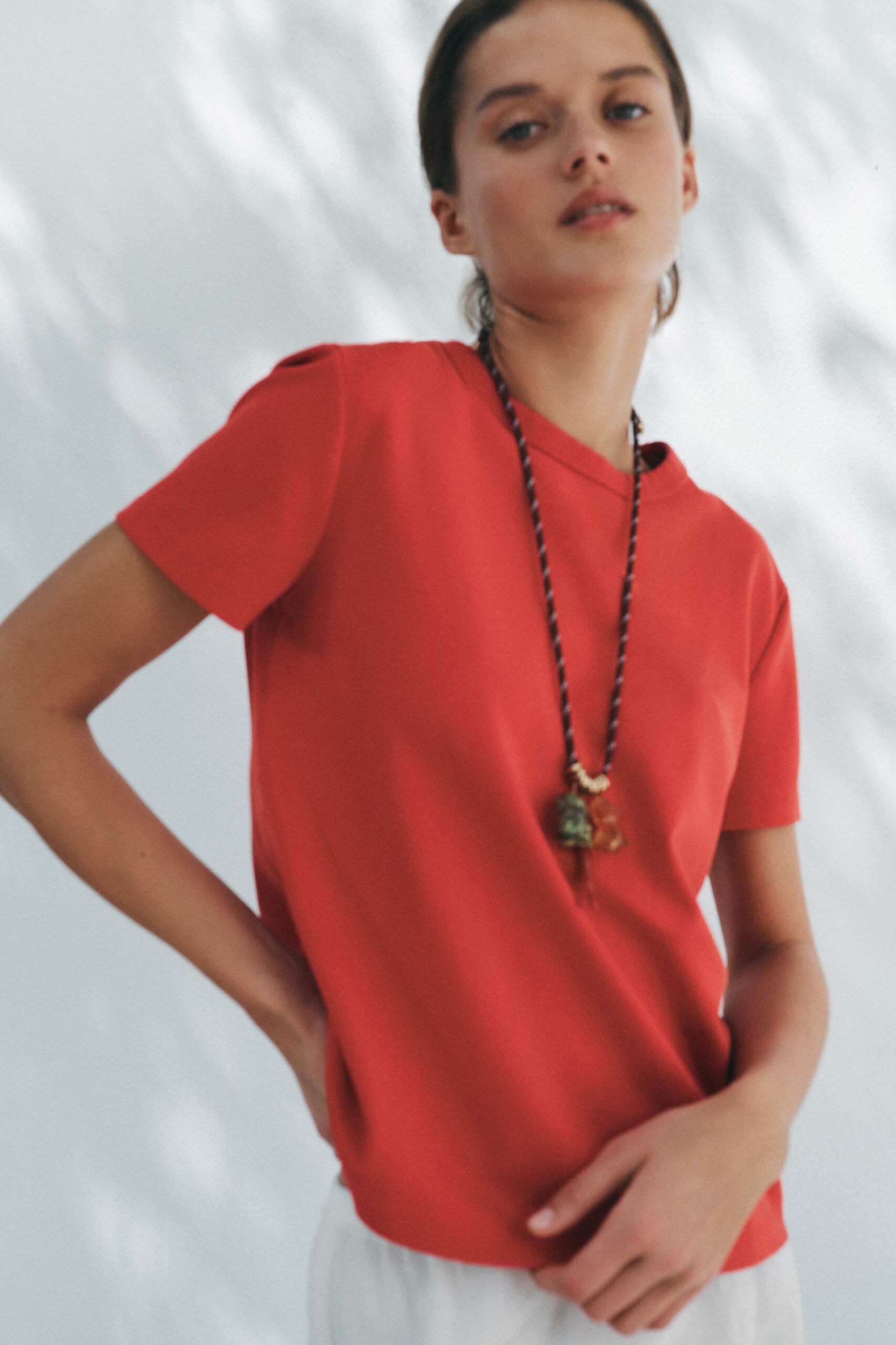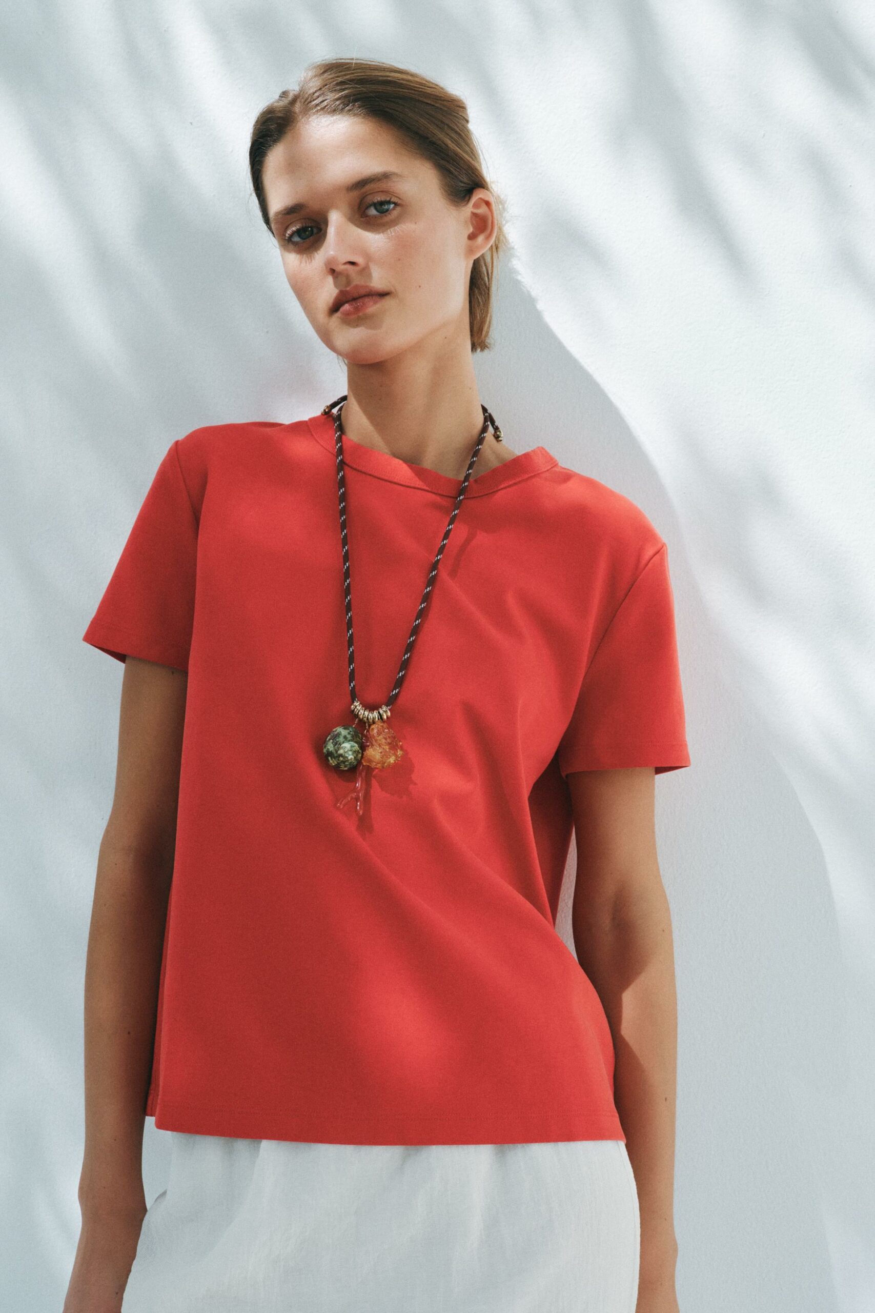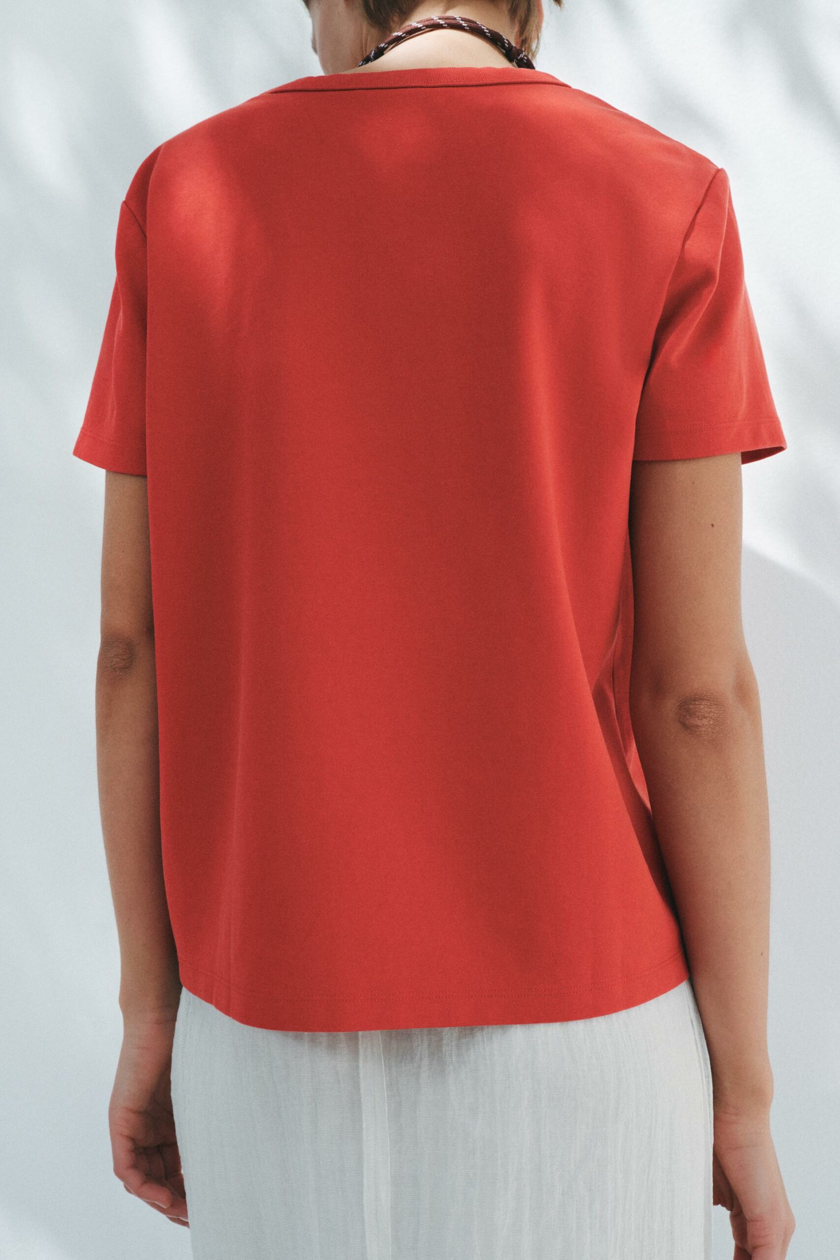 T-shirt en maille extensible et souple à trame compacte, moelleuse et opaque. Col rond et manches courtes.