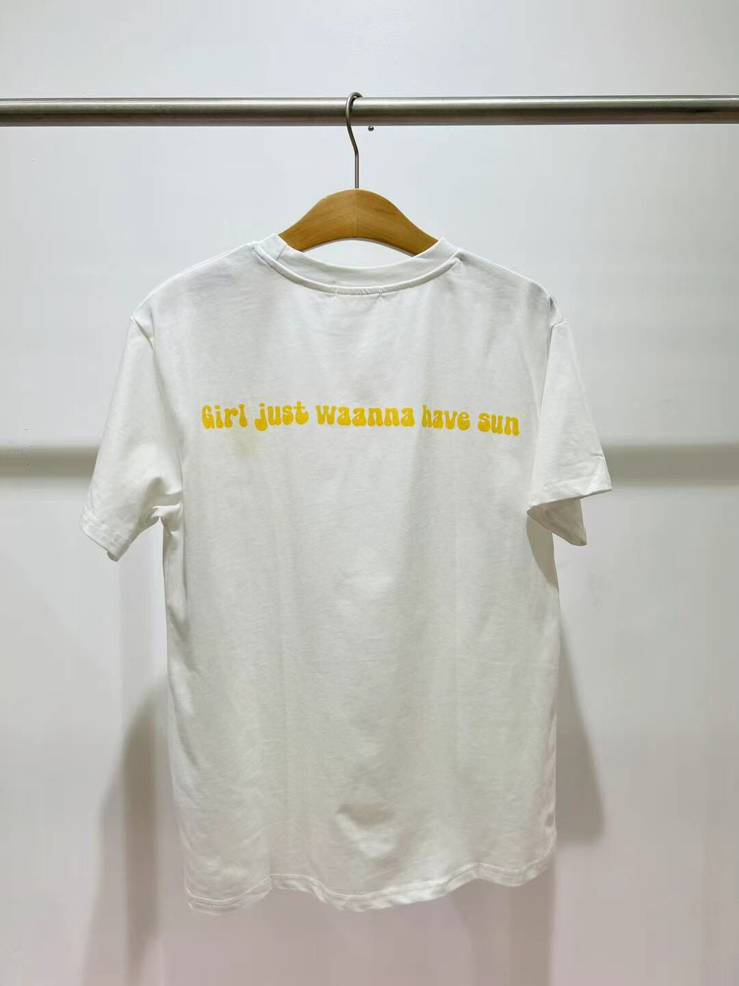 Inscription « Girls just waanna have sun » au dos en lettres jaunes