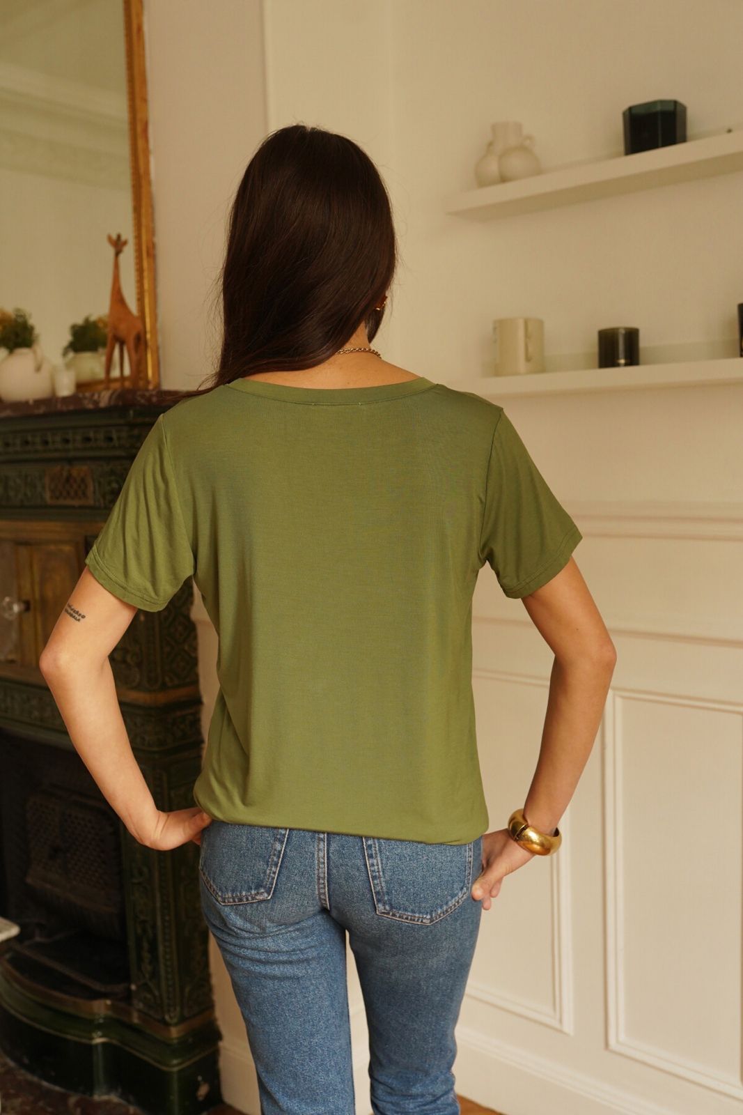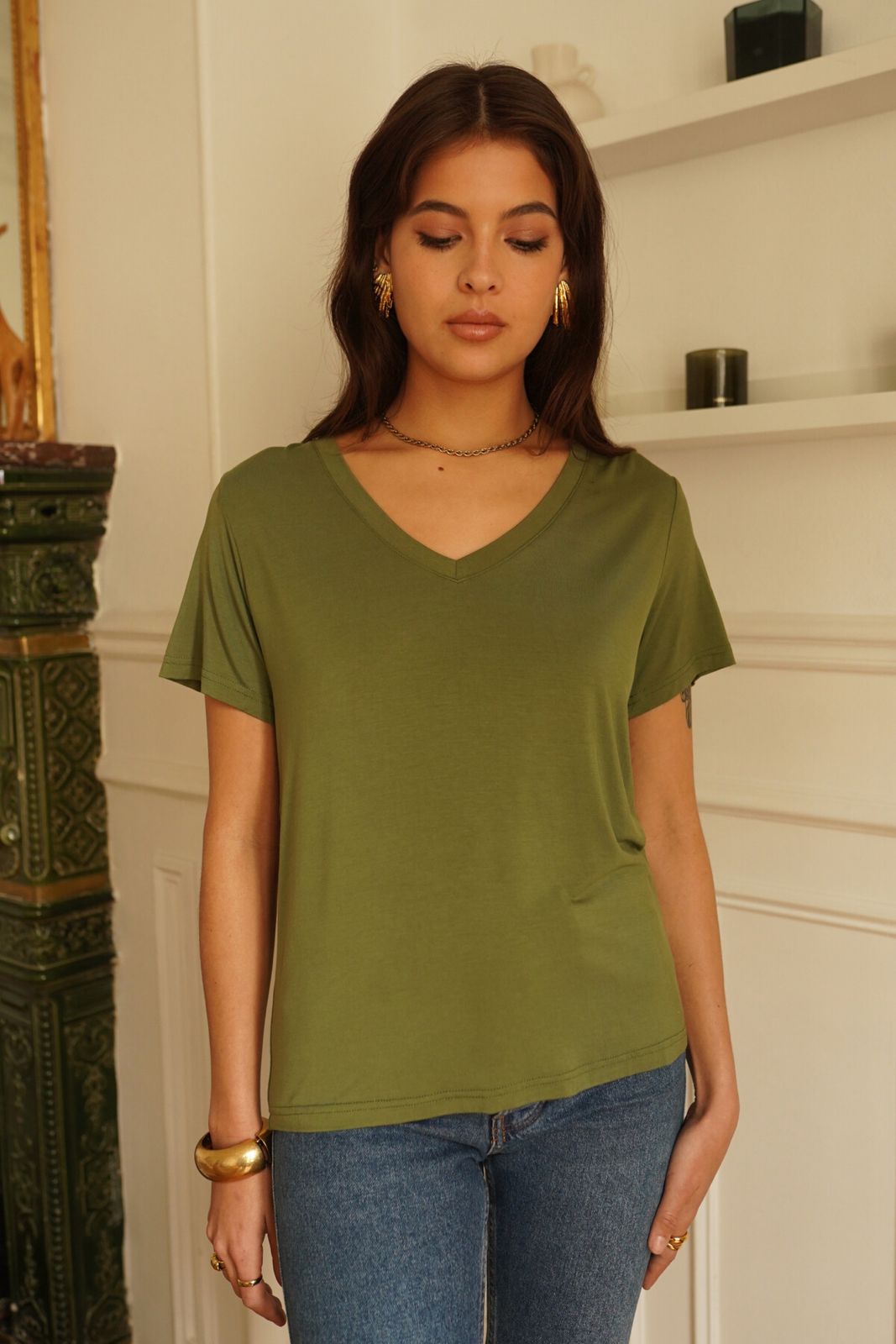 Top stretch col V kaki, léger et respirant