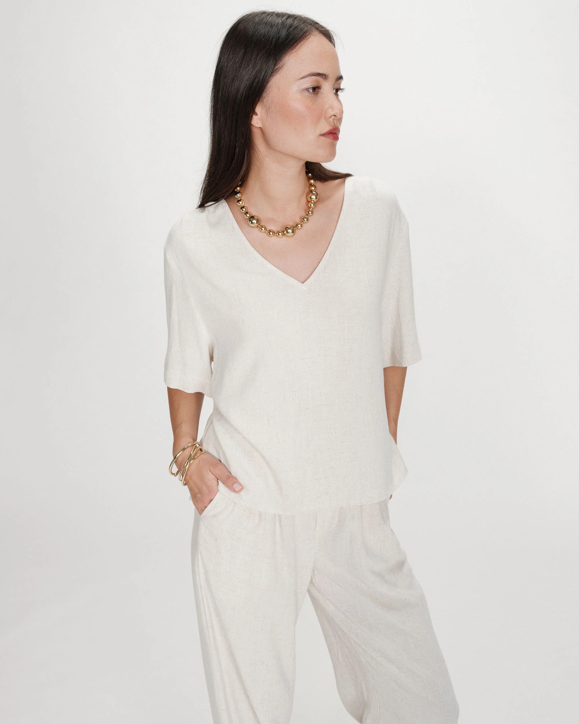 L’encolure en V du top large sublime le port de tête et le décolleté. Les manches mi-longues et les légers plis aux épaules apportent une touche de douceur et d’élégance à la silhouette. Le tissu fluide et léger du top à manches 3/4 VIOLON épouse les mouvements et propose une allure légère et décontractée